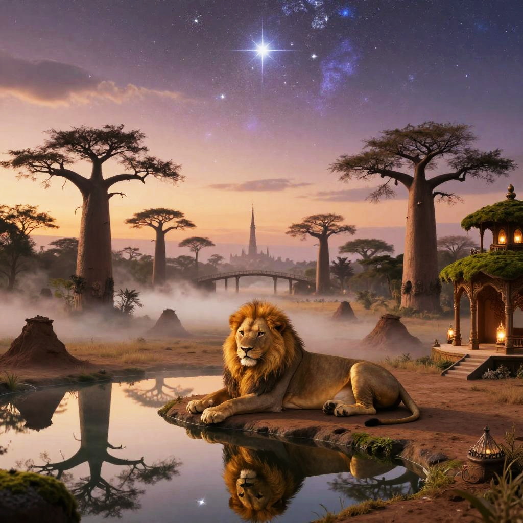 A vast golden-winged lion reclining beside a mirrored pool set within sun-drenched savanna scattered with baobab trees and termite mounds, wrapped in ethereal mist and drifting incense, glowing stars scattered above, a celestial vault painted with warm apricot and violet twilight with drifting dust particles. Tranquil waters mirror the heavens, distant spires and bridges on rocky arches, lantern-lit sanctuaries and mossy terraces, a serene dreamlike atmosphere with surreal, intricate details; cinematic composition, volumetric fog and light rays, hyper-detailed textures, high dynamic range, wide-angle vista, depth of field, soft rim light, subtle film grain, epic scale.