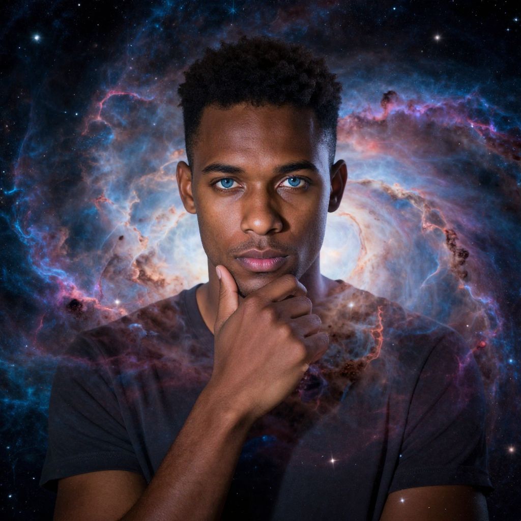 Photograph of a young Black man with short, curly black hair and striking blue eyes, gazing directly at the camera with a thoughtful expression. He is wearing a simple black t-shirt and has his right index finger resting on his chin. The background is a vivid, colorful nebula with swirling blue, purple, and pink clouds, set against a dark, star-studded space. The lighting highlights his facial features and the nebula behind him, creating a dramatic and otherworldly effect. The image combines portrait photography with digital effects, emphasizing a cosmic theme.