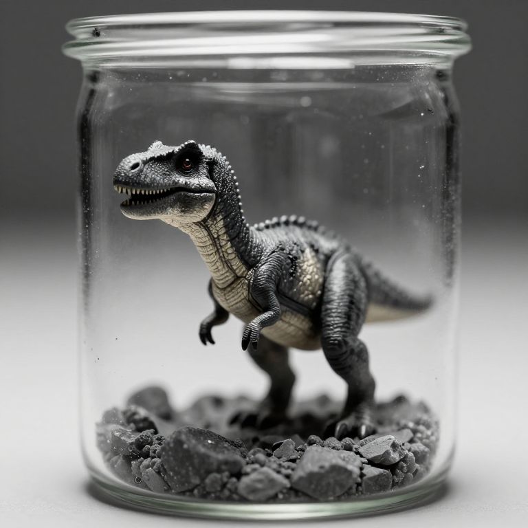 Award winning photo by saul leiter of a tiny gray dinosaur standing in a jar, tiny gaussian blur, insanely detailed, insanely intricate, depth of field, low contrast, snowy, wide aperture