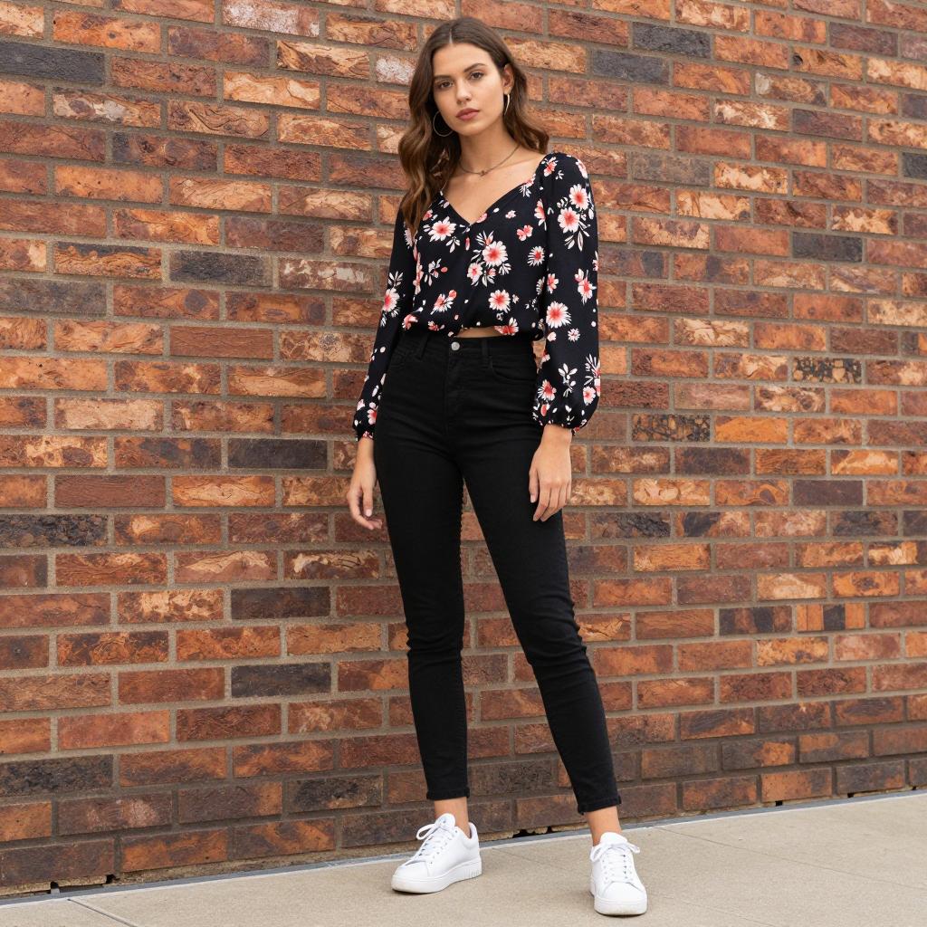 A young woman stands confidently against a textured red brick wall. She is wearing a black long-sleeve floral-patterned blouse paired with high-waisted black skinny pants and white sneakers. The outfit combines casual and trendy urban fashion elements.