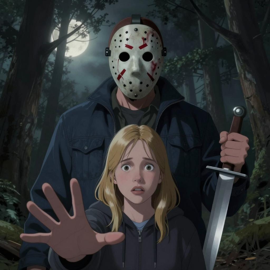 Illustration of a horror scene. Tall figure with a blood-stained Jason Voorhees mask, blue jacket, and large knife in right hand, looming over a frightened blonde girl with wide eyes, wearing a dark hoodie. Dark forest background with moonlight, tall trees, and mist. Figure's left hand extended towards the viewer. Girl's face centered in foreground. Jason's knife on right.