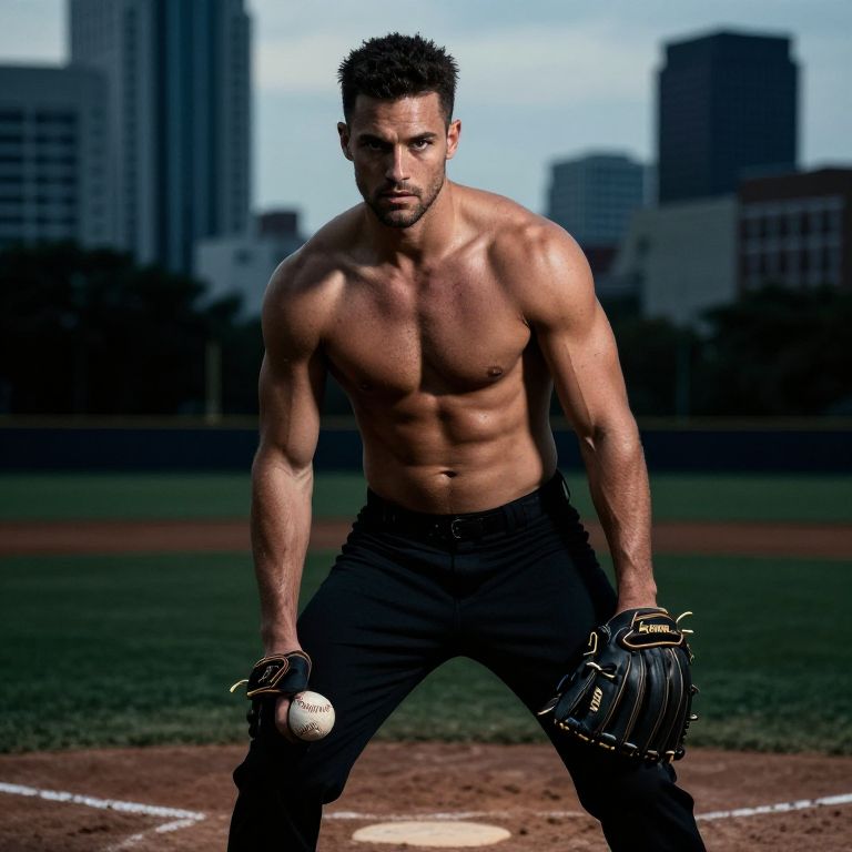 Rhys Hoskins shirtless, standing confidently on a baseball diamond at golden hour, sweat glistening, detailed skin texture, strong physique, sportswear atmosphere, cinematic lighting