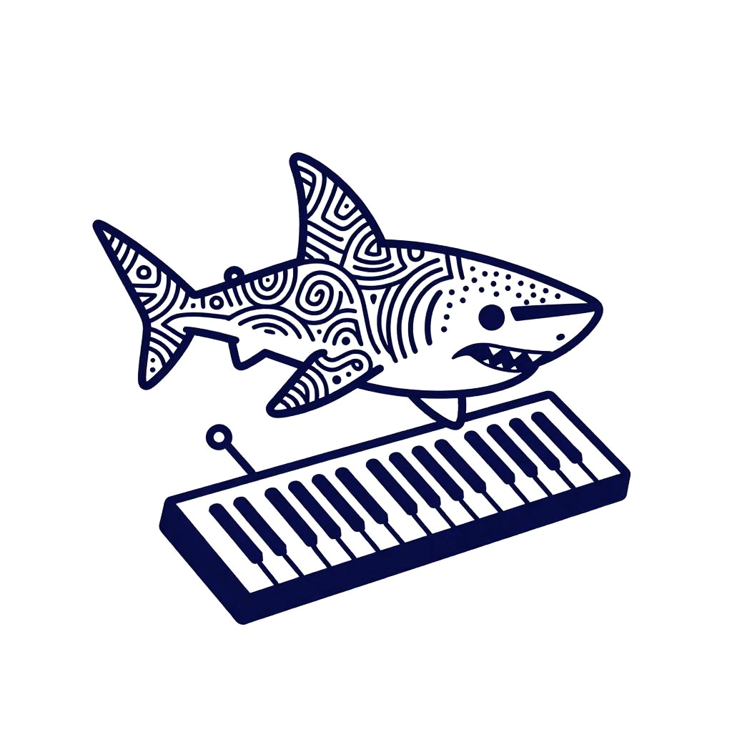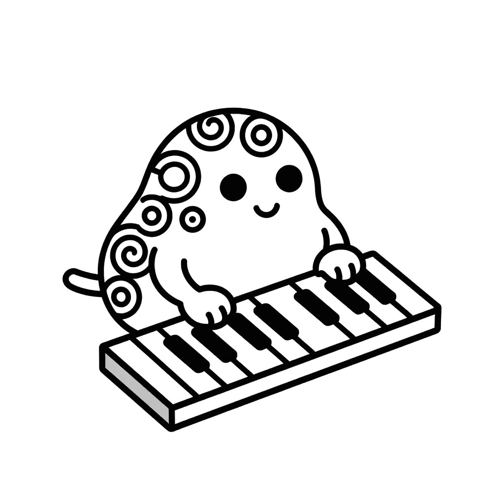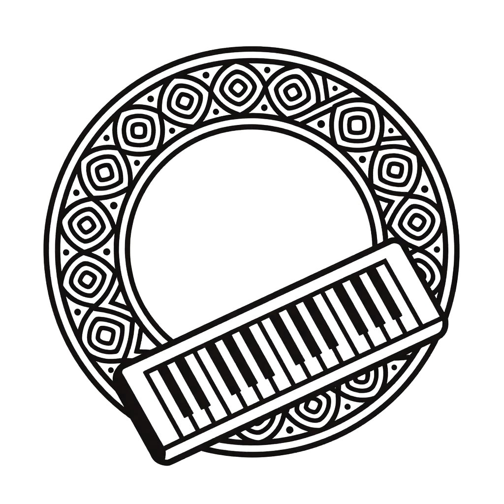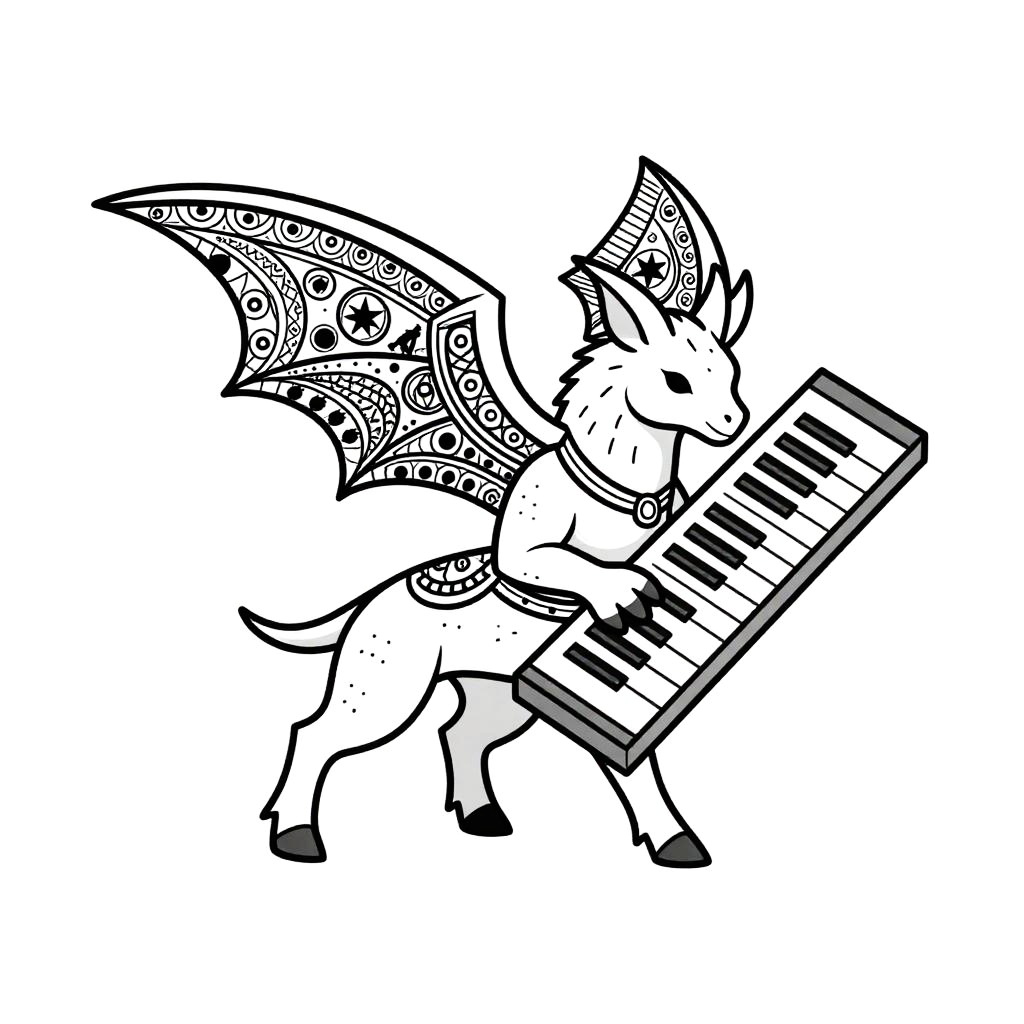Newt playing synth, inspired by Gond patterns, in line art style, perfect for a logo