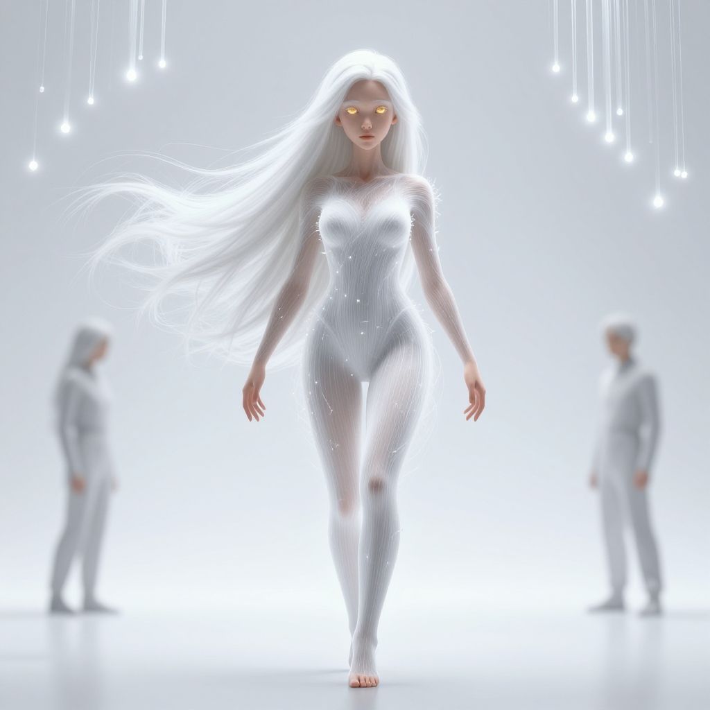 (wide view:2), (full body view:2), (looking outside:2), dinamic pose, standing, ((masterpiece:)), ((best quality)), ((High Quality)), 32k, (High Detailed Skin:1.3), (intricate details:1), (finely detailed:1), cinematic lighting, Realistic Lighting, volumetric, zbrush art, 3d, RTX, ray tracing, octane render, unreal engine, screen space reflections (ssr), white eyebrows, gold eyes, extremely detailed pupils and irises, long white hair, Fine strands of fiber optics emerge from her hair, enter and exit her body, white theme, background white and fiber leds, uncensored