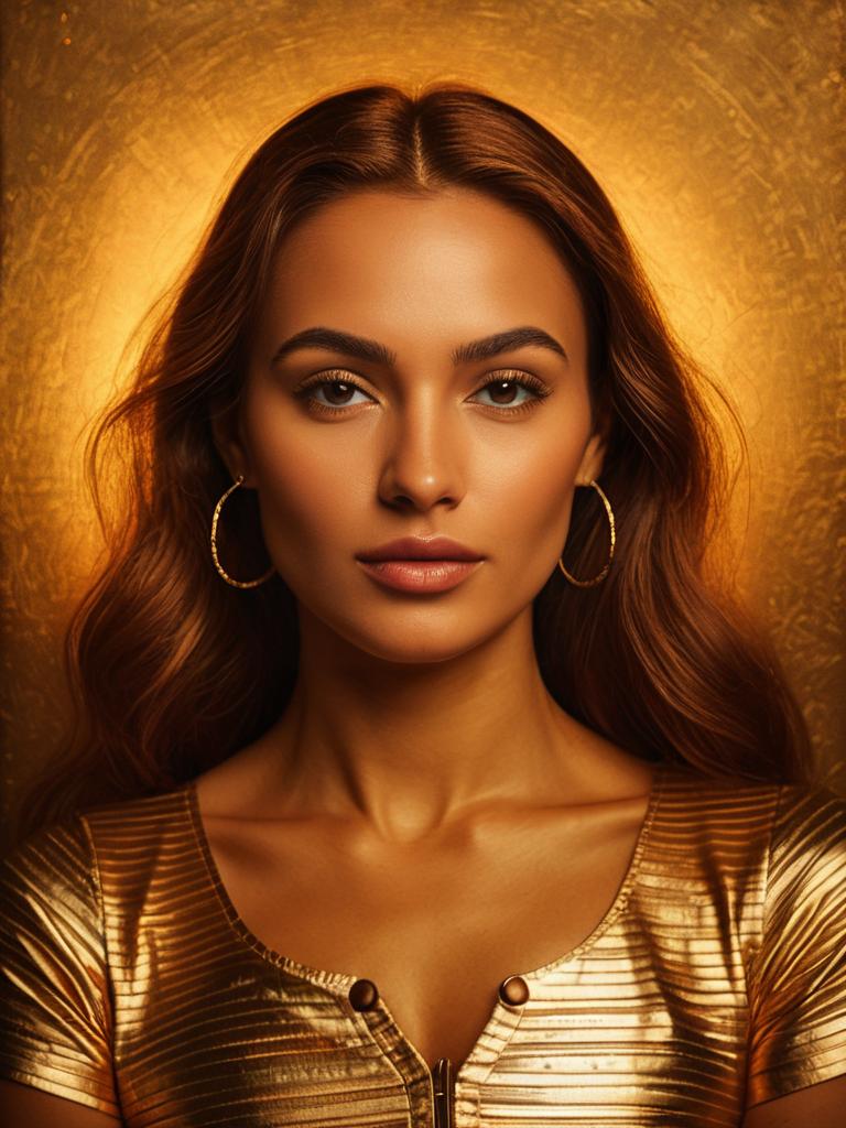 Woman, summery chic, V-neck mid-length dress in horizontal stripe pattern with hues of orange, white, and a hint of glitter threading, short sleeves with slightly rolled cuffs, front slit for ease of movement, ribbed texture, tan leather platform sandals with wide front strap and buckle, simple stud earrings, white studio background. --sref 1389