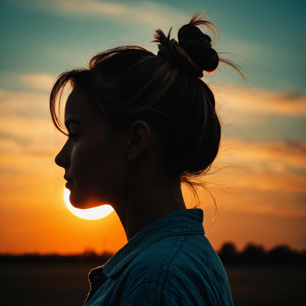A side profile portrait of a person with hair tied in a bun, standing against a large glowing sun during sunset, atmospheric mood with textured painterly style, dark silhouette contrasted with warm orange and muted blue background, vintage warm colors, soft clouds in the sky