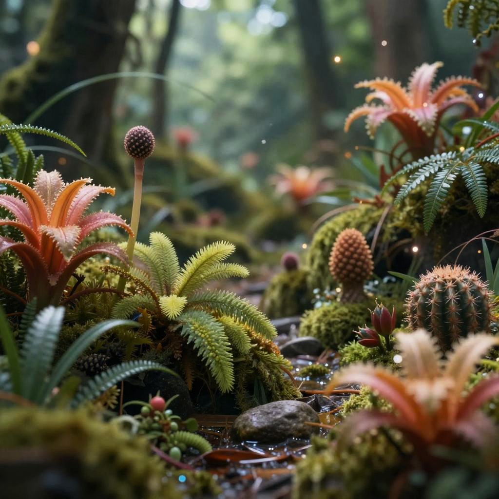 This photograph captures a lush, enchanted forest floor in vibrant detail. The scene is bathed in soft, natural light filtering through the dense canopy above. The foreground is dominated by a variety of exotic ferns and spiky plants, with hues of green, yellow, red, and orange. Notable are the spherical, spiky plant buds and the spiky, cactus-like plants. Moss blankets the ground and rocks, adding a rich, green texture. A small, clear stream runs through the middle, reflecting the surrounding flora. The background is a blur of more forest vegetation, creating a sense of depth. Tiny, glowing fairy lights are scattered throughout, enhancing the magical atmosphere.