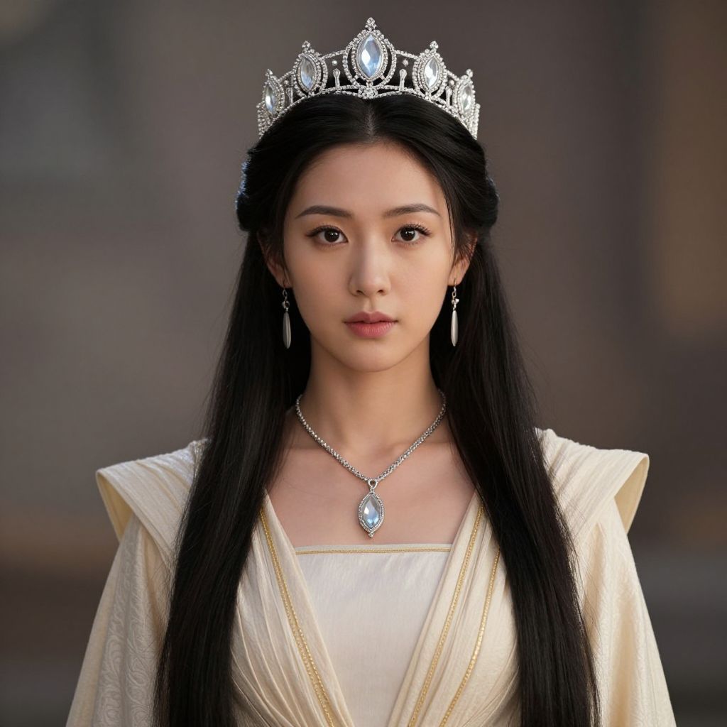 Queen amidala costume, 1girl, solo, jewelry, black hair, necklace, earrings, looking at viewer, crown, blurry background, long hair, blurry, realistic, upper body