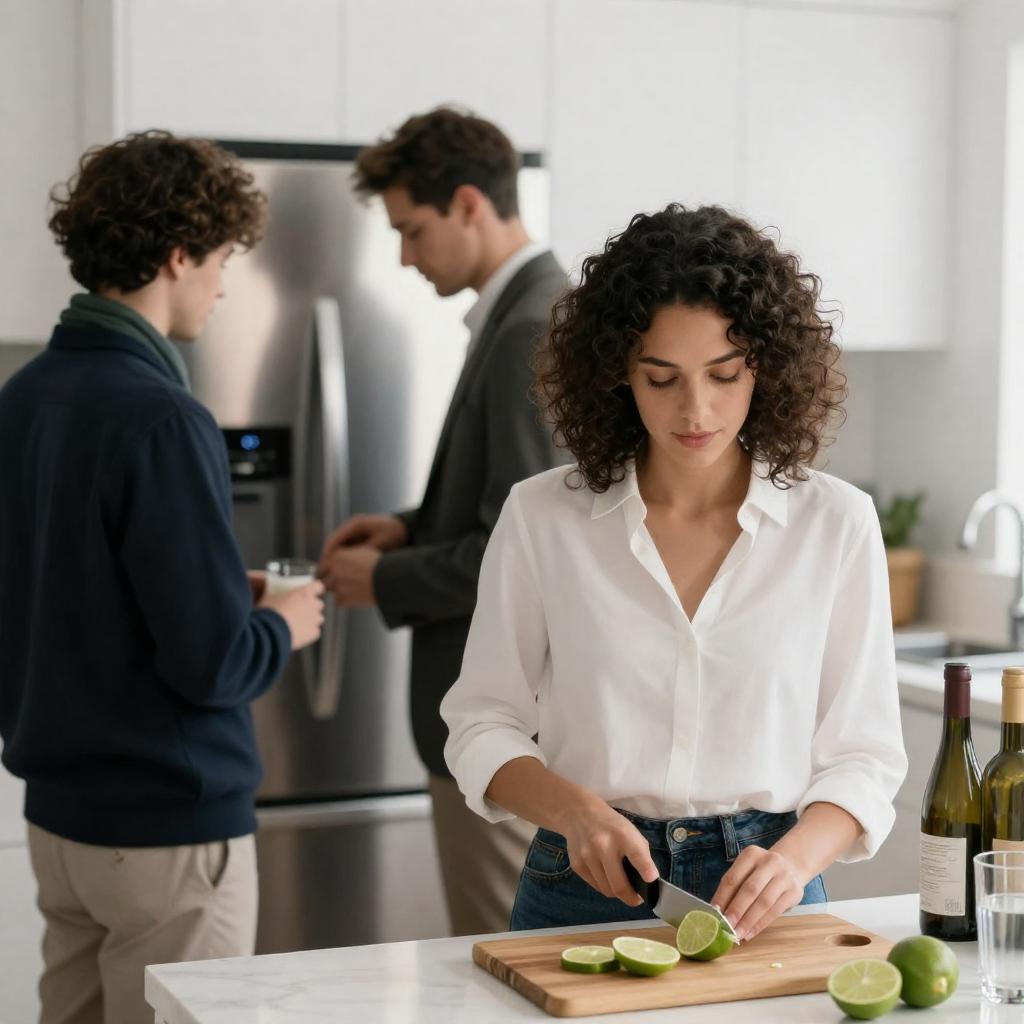 Photograph of a kitchen scene with three people. Foreground woman with curly dark hair, white shirt, slicing lime on wooden board. Left person in dark jacket, green scarf, facing away. Background man in suit, head down, standing by stainless steel fridge. Table with lime slices, bottles, and glass on right. Bright, white kitchen.