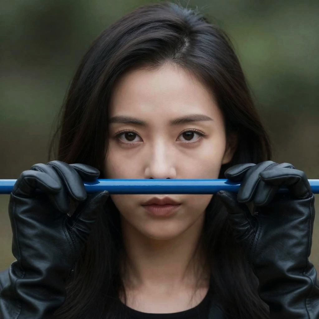 Photograph of a woman with long dark hair, wearing black leather gloves, holding a blue metal object across her face. Her eyes are visible, showing an intense, focused expression. Green blurred background. Foreground: blue metal object, black leather gloves.