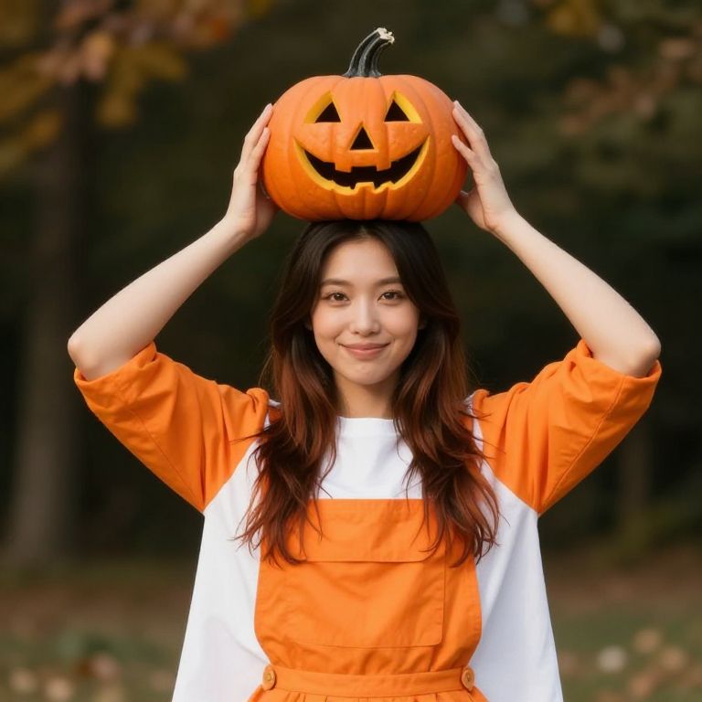 Photograph of an Asian woman with long, wavy brown hair, wearing an orange and white Halloween costume. She holds a carved pumpkin with a smiling jack-o'-lantern face above her head with both hands. The pumpkin has a small, curved black stem. She has light skin and a subtle smile. The background is a blurred, dark forest with autumn leaves. The costume has wide, flowing sleeves and a simple, white shirt underneath. The image is bright and colorful, with a focus on the woman and the pumpkin, capturing a festive, autumnal atmosphere.