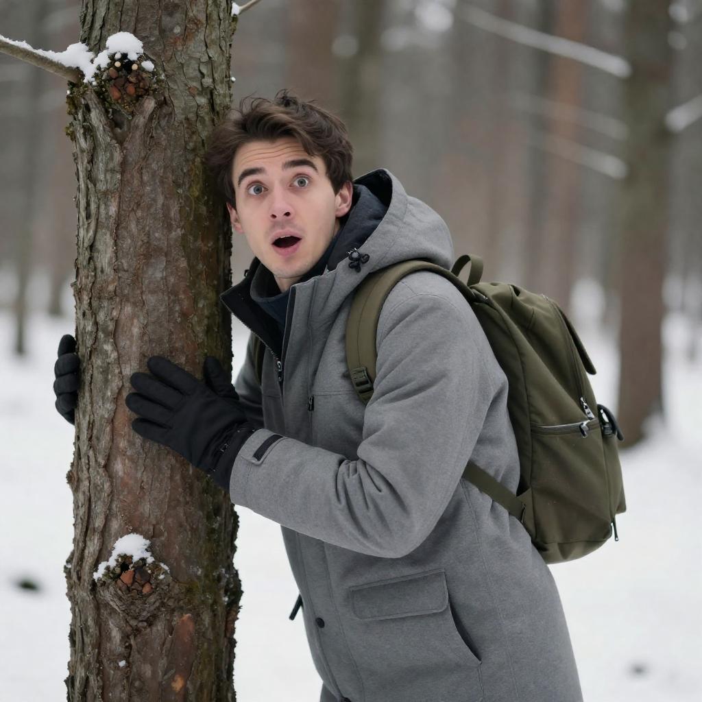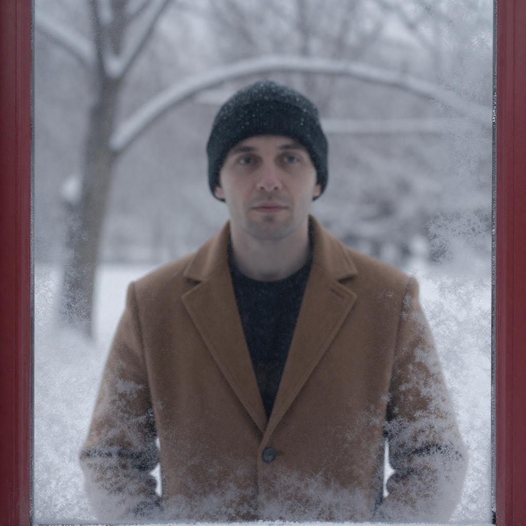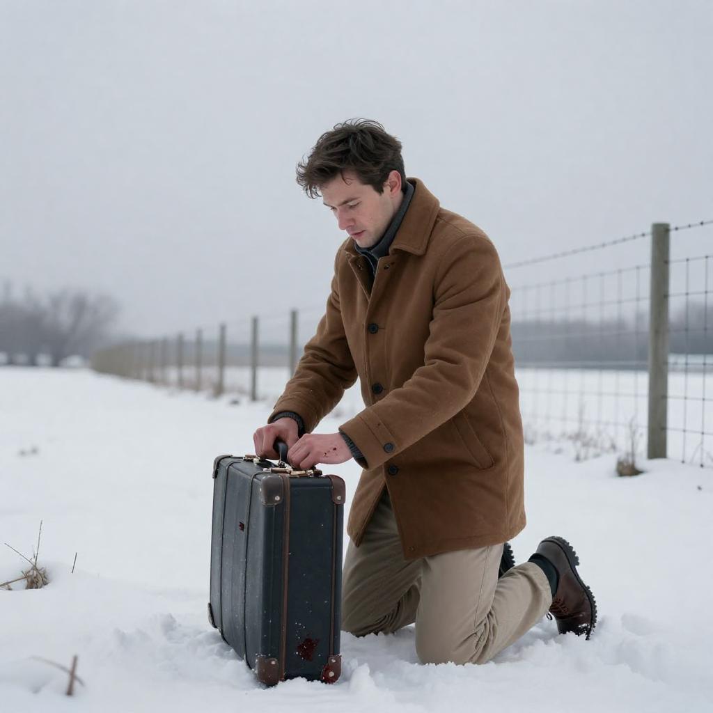 Photograph of a man with short dark hair, wearing a brown coat and beige pants, kneeling in a snowy field. He clutches a black suitcase with bloodstains on his hands and pants. A wire fence runs diagonally from the right background to the left foreground. The sky is overcast.