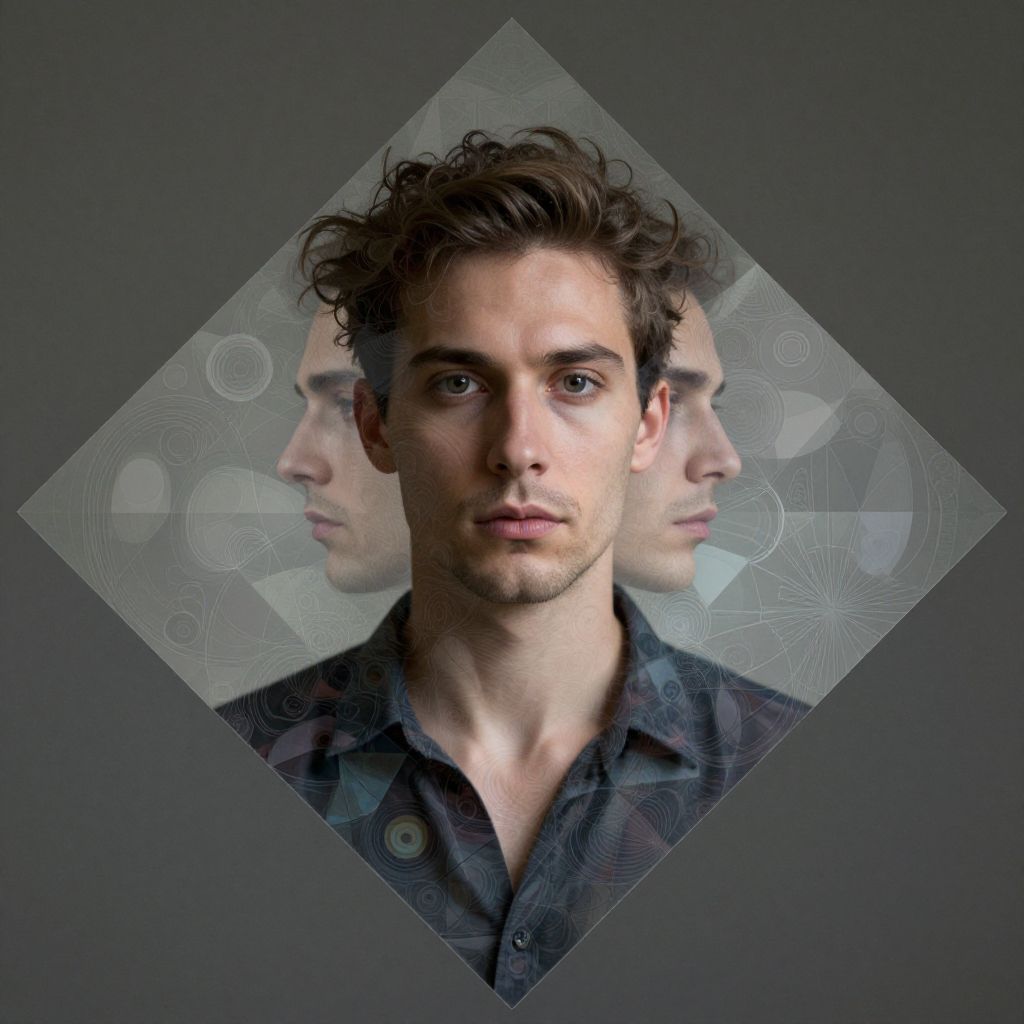 Photographic portrait of a young man with curly brown hair and piercing blue eyes, centered within a diamond-shaped frame. He wears a dark, slightly unbuttoned shirt, revealing his neck. The background is a muted gray with abstract, circular patterns. Behind him, a slightly blurred, mirrored image of his profile adds a sense of depth and surrealism. The lighting is soft, highlighting his facial features and creating a contemplative mood. The overall style combines realistic photography with digital manipulation for a modern, artistic effect.