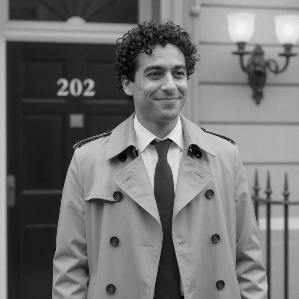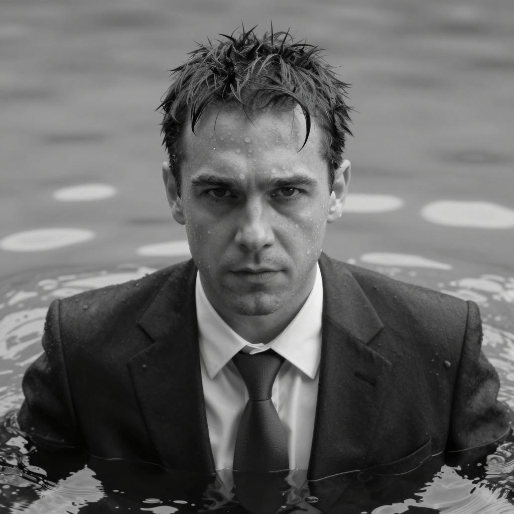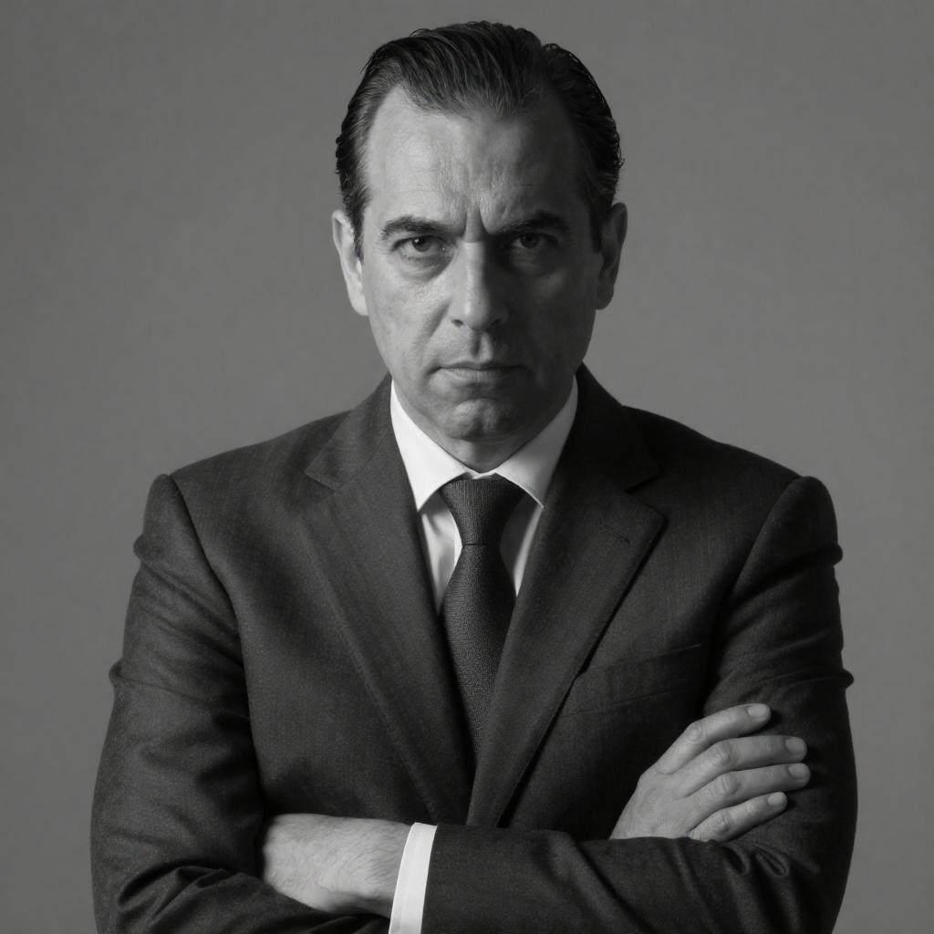 Black and white photograph of a man with short, dark hair, wearing a suit and tie, leaning forward with a serious expression. Shadowed face, strong light source from the right. Background is dark and indistinct.