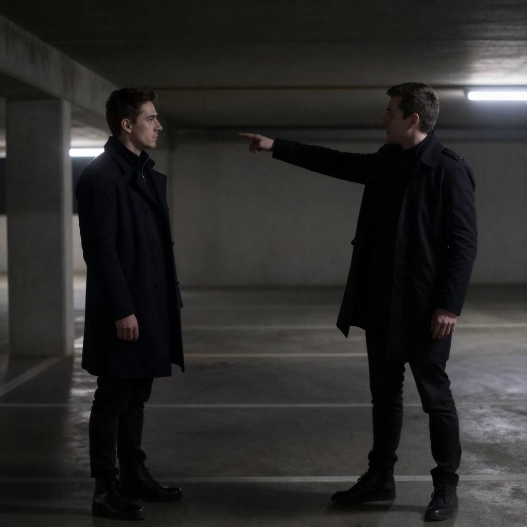 Two men in dark clothing stand in a dimly lit underground parking garage. The man on the right extends his arm, pointing his finger at the man on the left. Concrete pillars and a concrete ceiling frame the background. The man on the left is in a long coat, while the man on the right is in a shorter coat. Both figures are in shadow, with only their silhouettes and pointing gesture clearly visible.