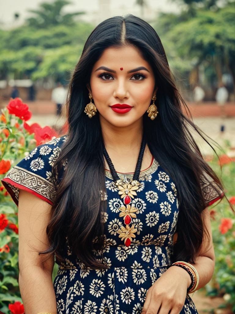 Portrait of a young South Asian woman with long black hair wearing a black full sleeve saree blouse adorned with white floral patterns. She has brown eyes, wears elegant floral earrings, red lipstick, and subtle makeup, posing outdoors with a blurred natural background.