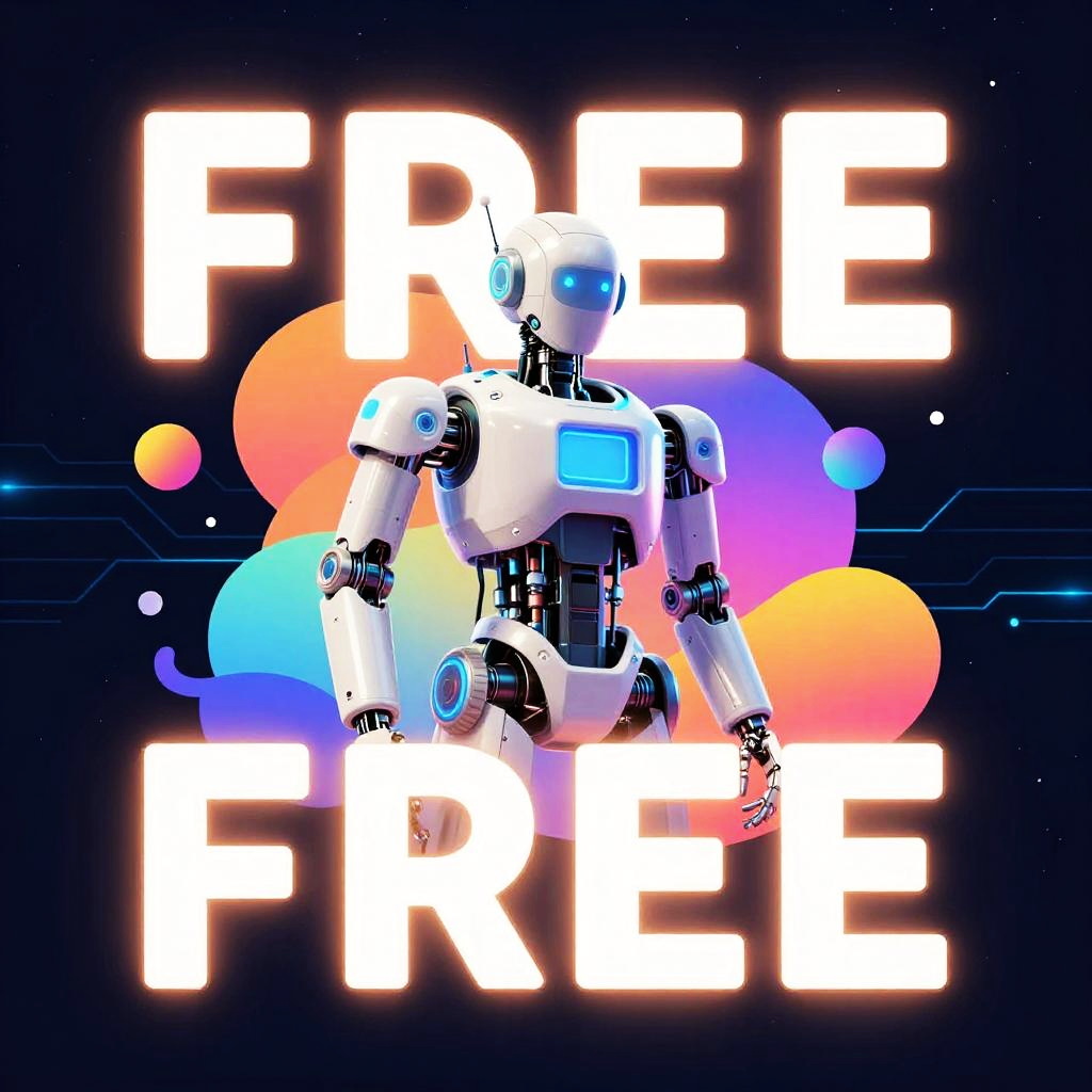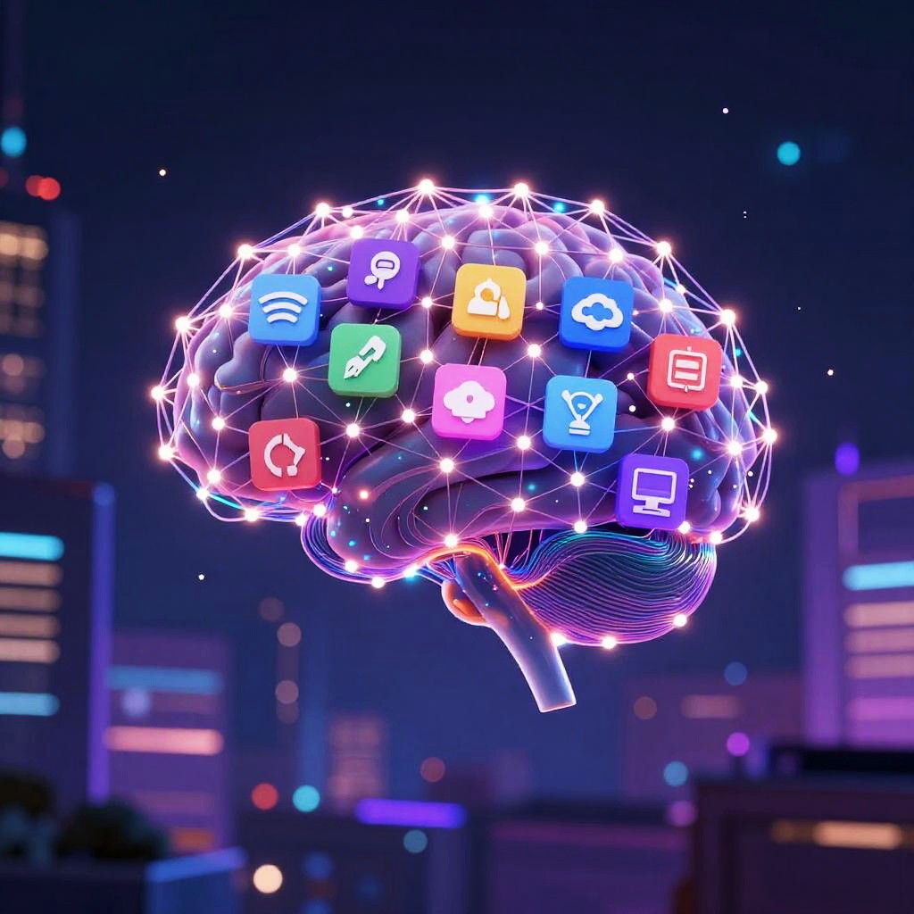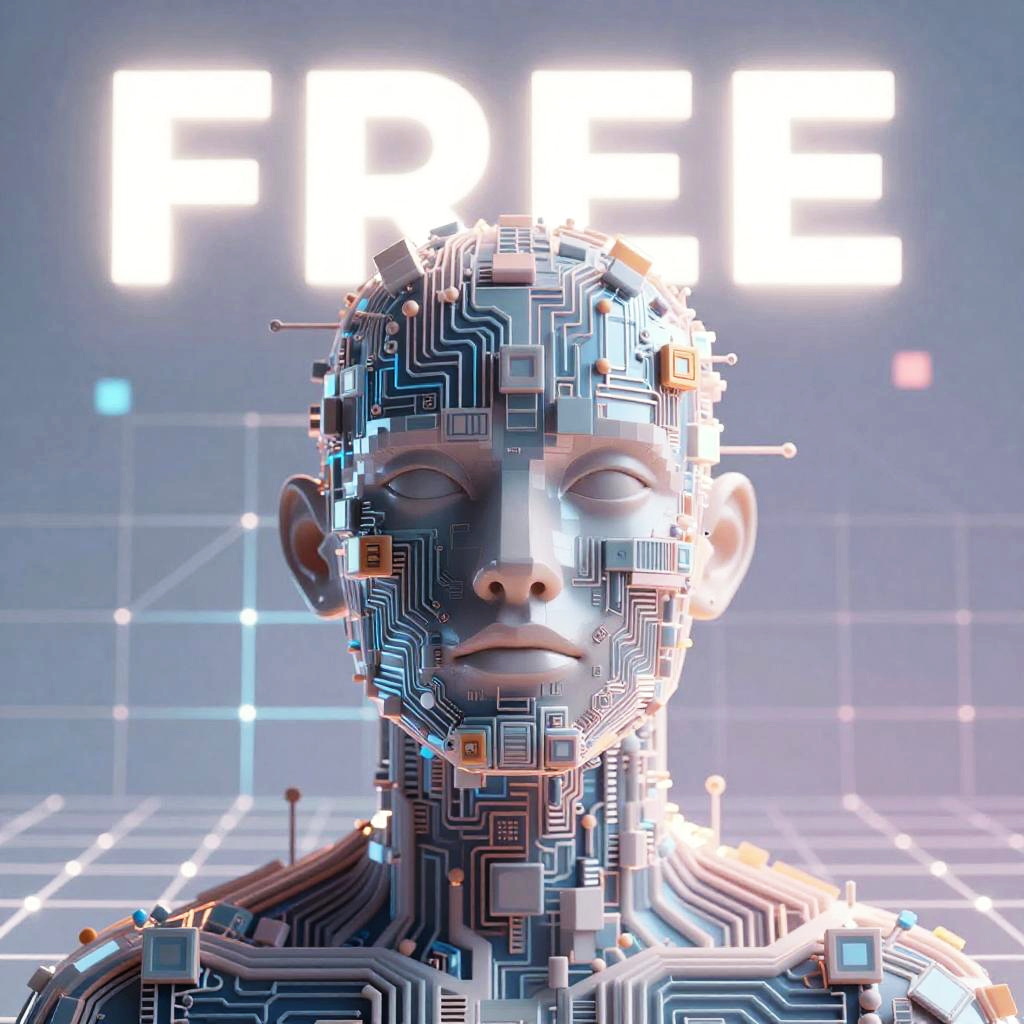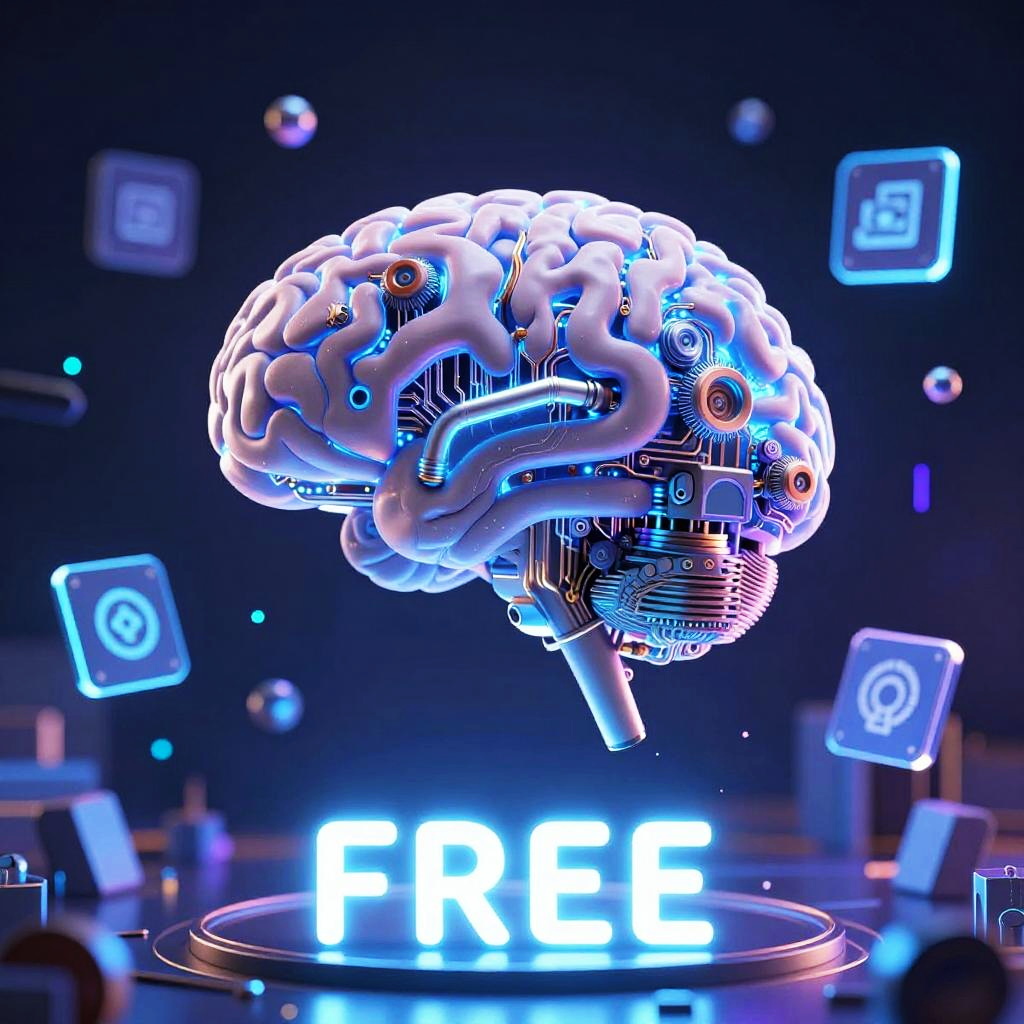 Free AI creator concept art depicting a glowing brain integrated with machinery and circuits, surrounded by floating icons and digital tools, vibrant electric blues and purples, blending organic and technological forms in a surreal style.