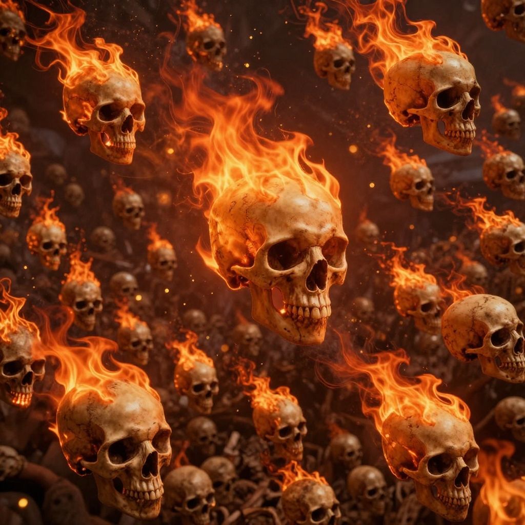 Photograph-like digital artwork of numerous human skulls floating in mid-air, engulfed in bright, vivid orange flames against a dark background.
