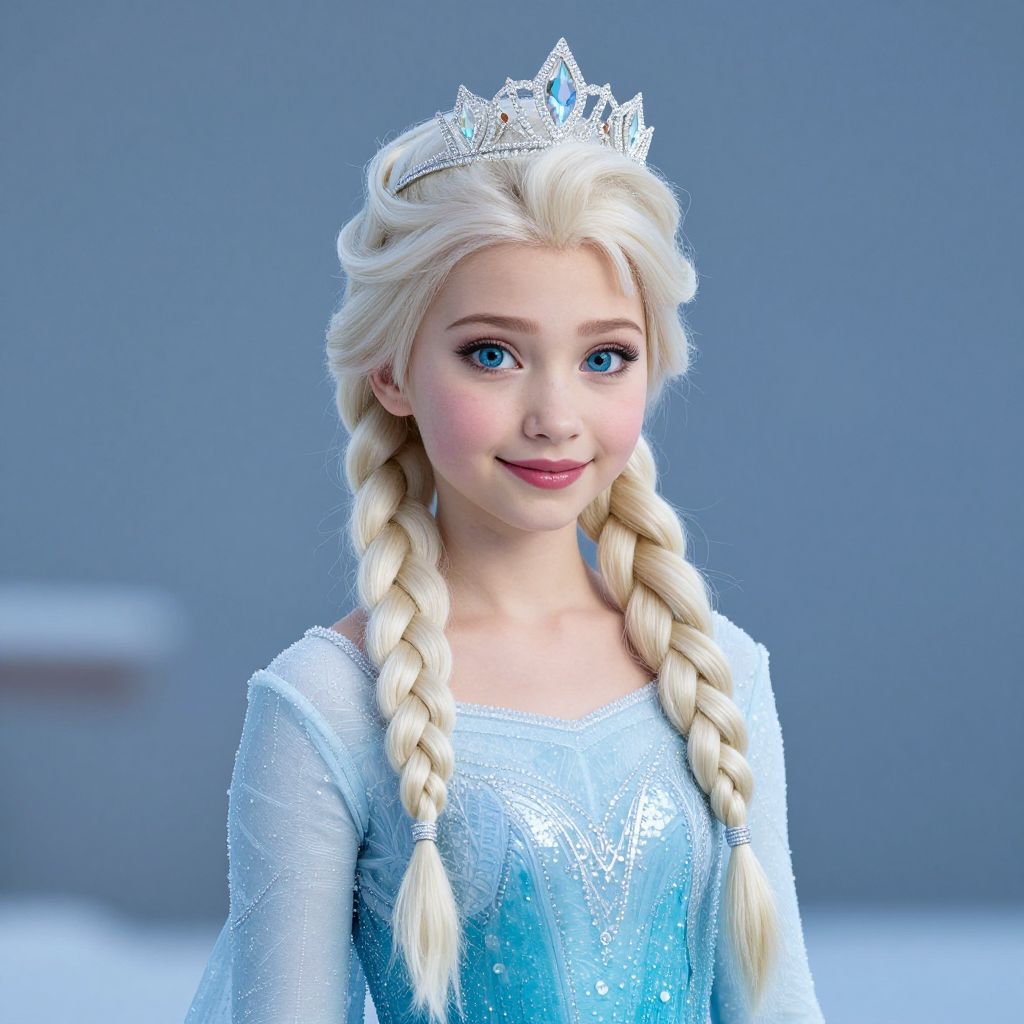 This is a digital CGI image of a young, fair-skinned girl with striking blue eyes and long, platinum blonde hair styled in two braids. She wears a sparkling, silver tiara adorned with blue gemstones and a white, long-sleeved, lace dress with a shimmering blue bodice. Her makeup is subtle, with pink blush and light pink lipstick. The background is a soft, out-of-focus blue, giving a dreamy effect. The girl's expression is gentle and slightly smiling, exuding a magical, princess-like charm. The image has a polished, animated style, reminiscent of Disney's Frozen character design.