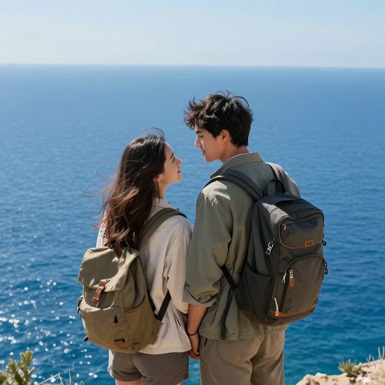 Embracing the boundless allure of adventure, two souls entwined in love stand at the edge of a serene, azure expanse, their hearts echoing the whispers of freedom and infinite possibility.