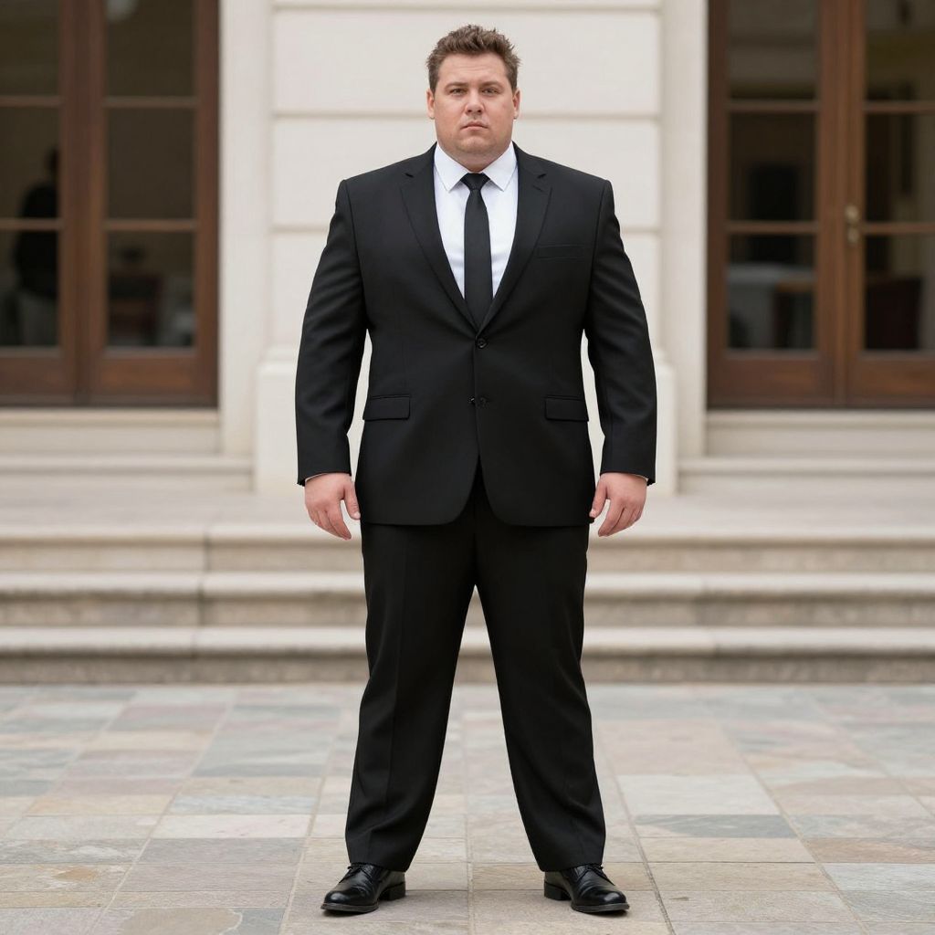Plus Size Black Suit Costume, man standing in front of a building with a coat on