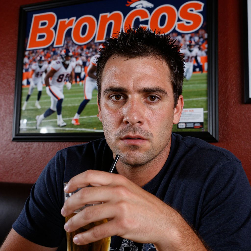 A high-resolution photograph of a man in his early 30s with a rugged facial structure, dark brown eyes, and a weathered look, sitting in a dimly lit sports bar in Denver, holding a drink, with a large framed photo of the Denver Broncos on the wall behind him, the word 'Broncos' clearly visible in bold red letters.