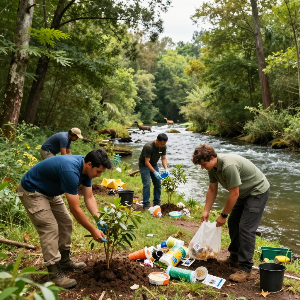 EPA environmental cleanup operation in a lush forest beside a river, workers planting trees and collecting waste, wildlife in the background, bright daylight, realistic textures, vivid greens and blues, hopeful and inspiring atmosphere