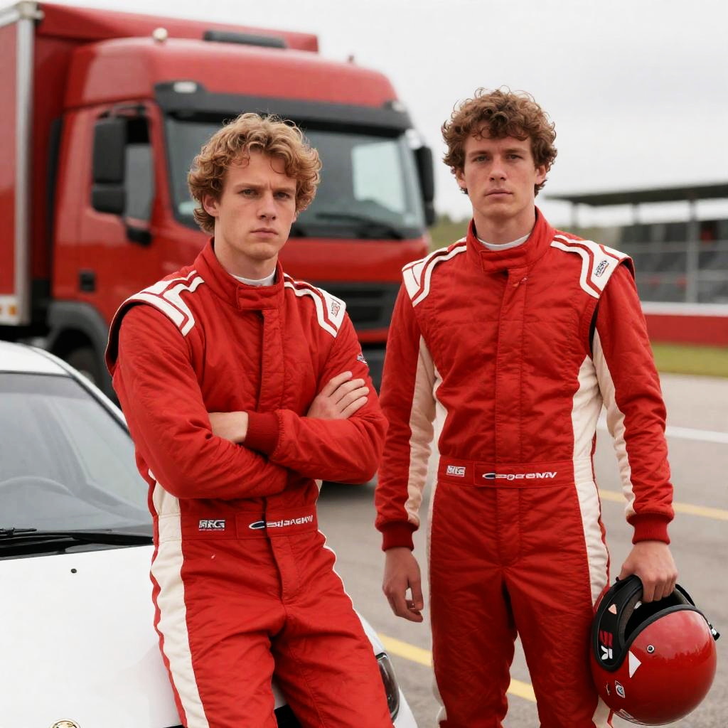 Two male race car drivers in red racing suits standing in front of a red truck and a white car. Both have light brown curly hair. Driver on left sits with arms crossed, expression intense. Driver on right holds red helmet, expression neutral. Background includes overcast sky and track pit area.