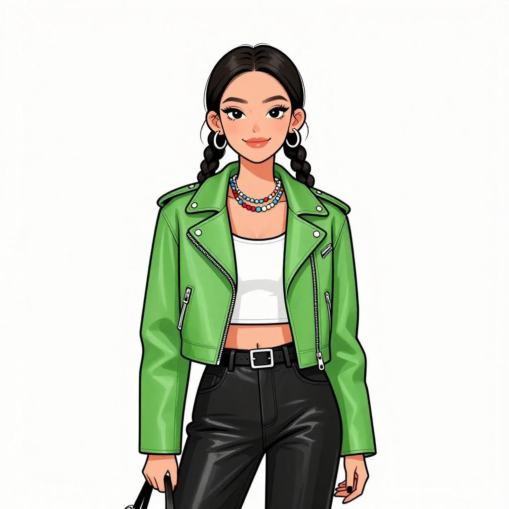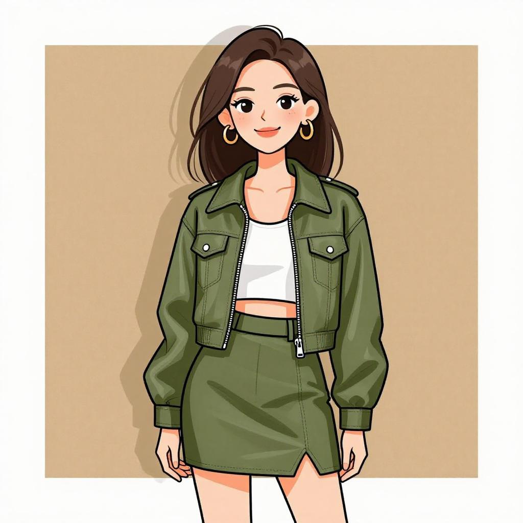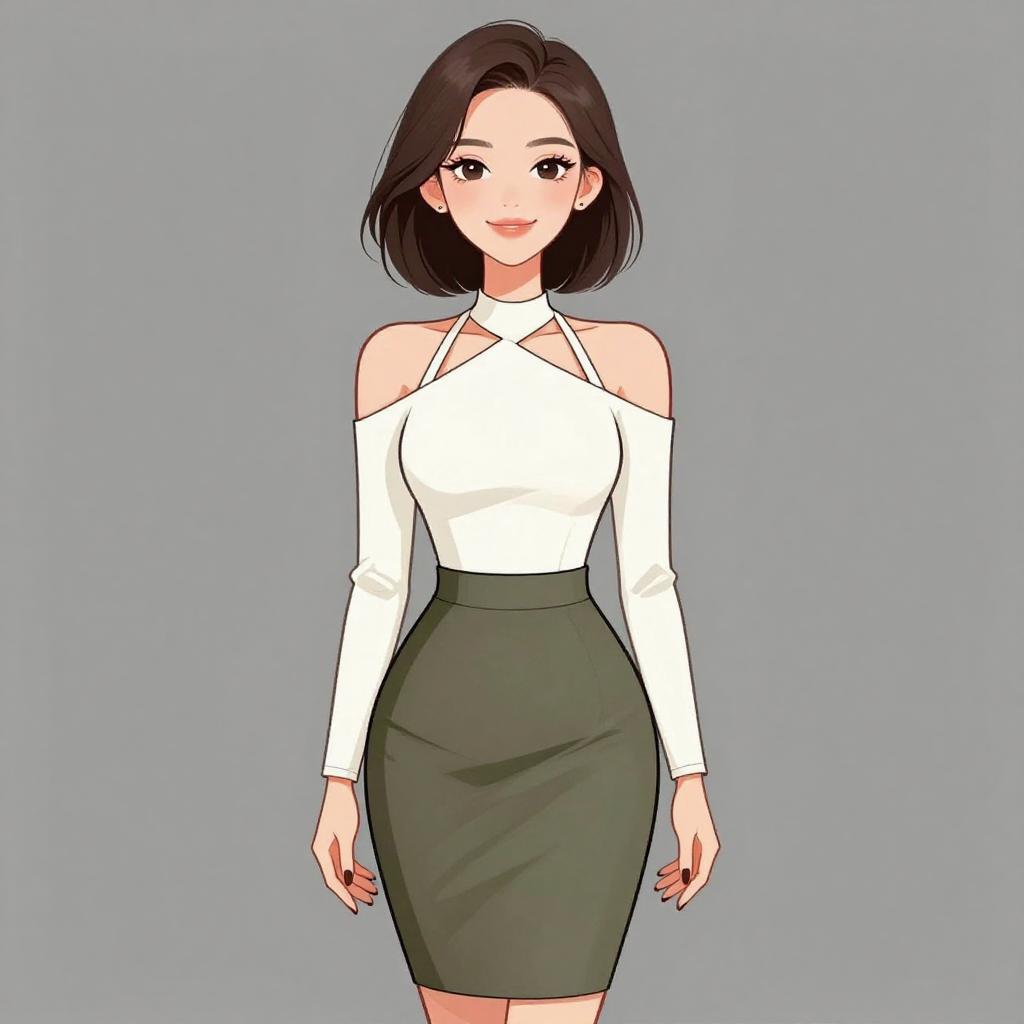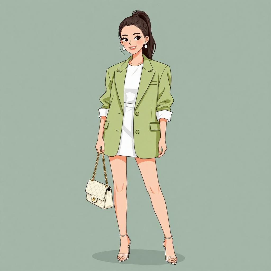Woman with pretty face and pretty hair. smiling Woman, contemporary chic, oversized blazer in light olive green, notched lapels, single-button closure, rolled-up sleeves, paired with a white mini dress, simple round neckline, sleeveless, off-white quilted shoulder bag with chain strap, clear pointed-toe heels with high stiletto, white drop earrings, slick high ponytail, studio background with a --sref 1467