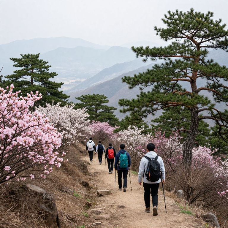 Otsuki mountain hiking trail in early spring, hikers traversing a path lined with blooming azaleas and ancient pine trees, misty valley views stretching into the distance, impressionist style, soft natural light capturing peaceful adventure