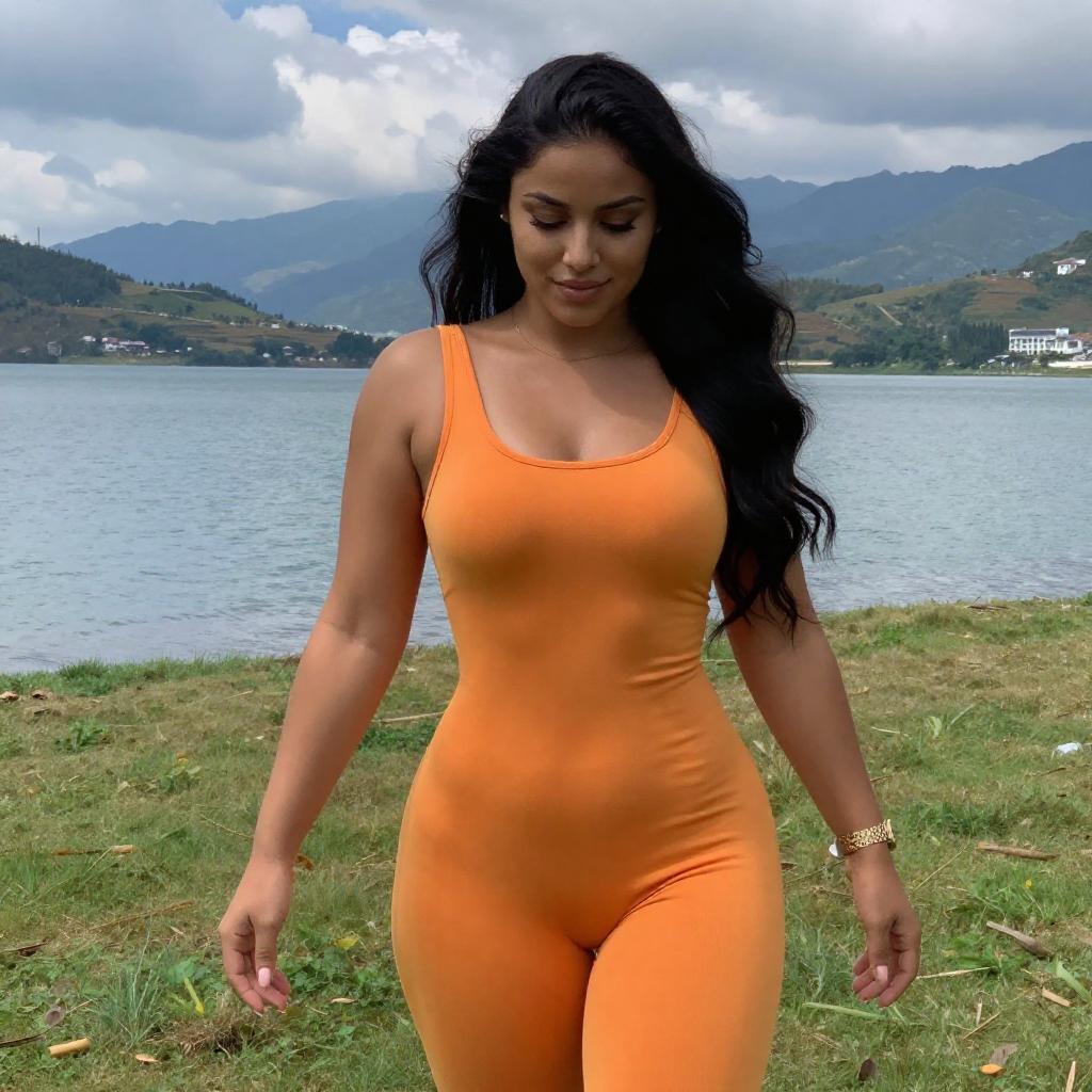 Photograph of a curvy woman with long black hair, wearing a bright orange, form-fitting jumpsuit, standing on a grassy lawn. She has a light brown skin tone, a gold watch on her left wrist, and is looking down with a slight smile. Behind her, a clear blue lake and mountainous landscape under a partly cloudy sky are visible.