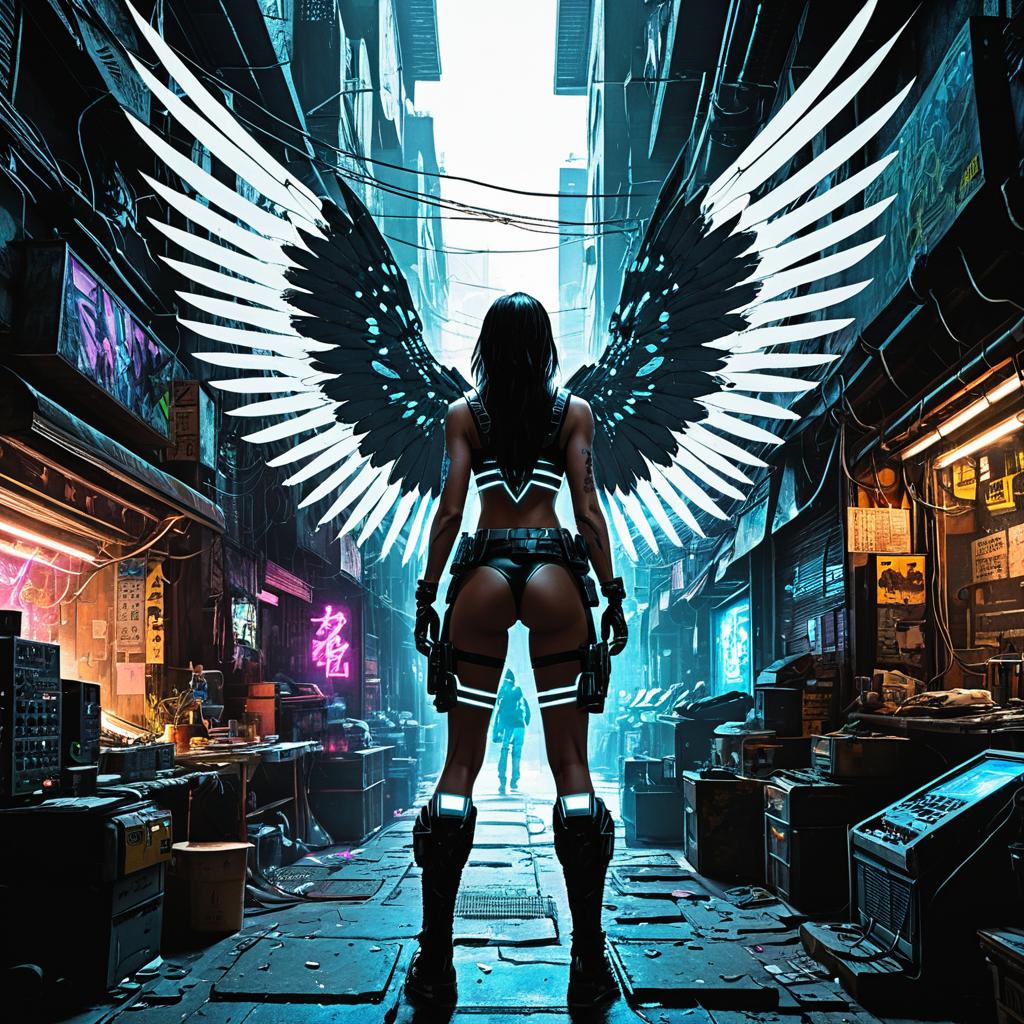 Sana warrior dissecting her cyber-augmented wings in a gritty back-alley bazaar glowing under fractal holograms, illustrated as a page from Cyberpunk 2020, merging a fusion of Hideki Kakinuma’s layered shadows and James Harrison’s kinetic linework, populated with NetWatch agents and V's ghost. Rendered in stark black-and-white ink on a white background, evoking 1990s comic book energy.