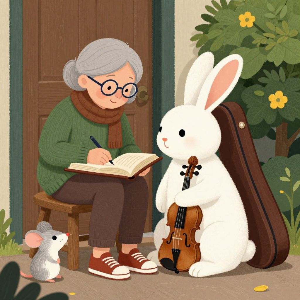 In this captivating illustration, a serene elderly woman with gray hair and glasses sits on a wooden stool, engrossed in writing in a large open book. She wears a cozy green sweater, a brown scarf, and red sneakers, exuding a sense of warmth and comfort. To her right, a large white rabbit, adorned with a brown violin case, sits attentively, its ears perked up as if listening intently. A small white mouse, with a pink nose and a tuft of hair on its head, sits on the floor, seemingly observing the scene. The background features a wooden door with a dark green frame, and a lush green bush with yellow flowers, adding a touch of nature to the setting. The overall composition is balanced, with the woman and the rabbit as the central figures, while the mouse and the violin case create a sense of depth and intrigue. The colors are soft and muted, with the green of the woman's sweater and scarf contrasting beautifully against the brown of the violin case and the wooden stool. The interplay of shapes and textures, from the smooth pages of the book to the rough texture of the mouse's fur, adds to the richness of the scene.