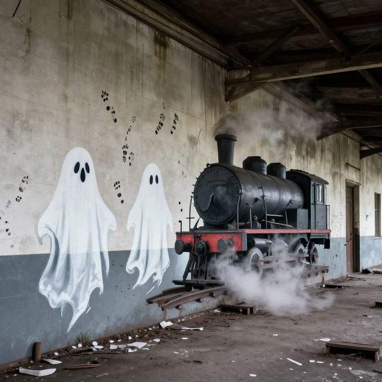 Ghosts paint their memories onto the walls of an abandoned train station using only their footprints and the steam from forgotten engines.