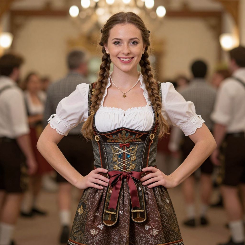Photograph of a young white woman with fair skin and long brown hair in two braids, smiling confidently. She wears a traditional Bavarian dirndl with a white blouse, puffed short sleeves, and a dark brown, intricately patterned skirt with a red apron and laced bodice. She has a delicate gold necklace and stands with hands on hips in a warmly lit, blurred indoor setting with chandeliers and people in similar attire in the background. The image has a soft focus effect, emphasizing the subject against the bokeh background.
