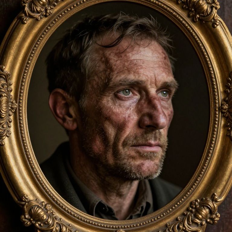 A photograph of a middle-aged, Caucasian man with weathered, rugged features and a slightly disheveled appearance, framed within an ornate, gold, oval-shaped picture frame. His skin is rough and marked with visible scars, his blue eyes are piercing, and his short, graying hair is tousled. He has a thin, unkempt mustache and beard. He wears a dark, buttoned shirt. The background is dark, drawing focus to his face. The gold frame has intricate floral patterns and is centered in the image, highlighting the man's intense, thoughtful expression. The photograph has a high-contrast, dramatic lighting style.