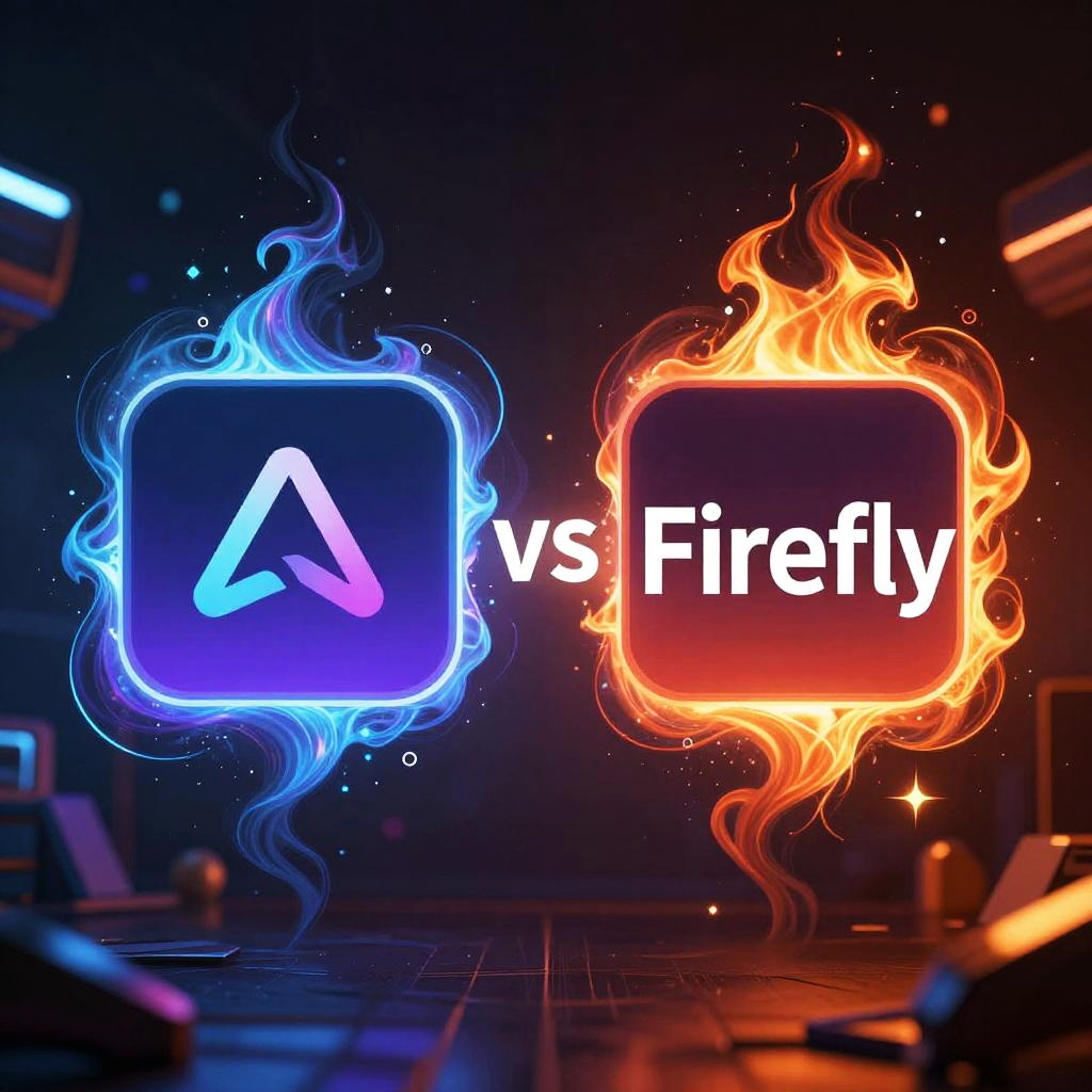 MidJourney vs Adobe Firefly showdown, futuristic digital art battle, vibrant colors, sleek user interface elements intertwined with fiery abstract flames, dynamic brush strokes blending technology and creativity, high contrast with glowing highlights, cyberpunk aesthetic