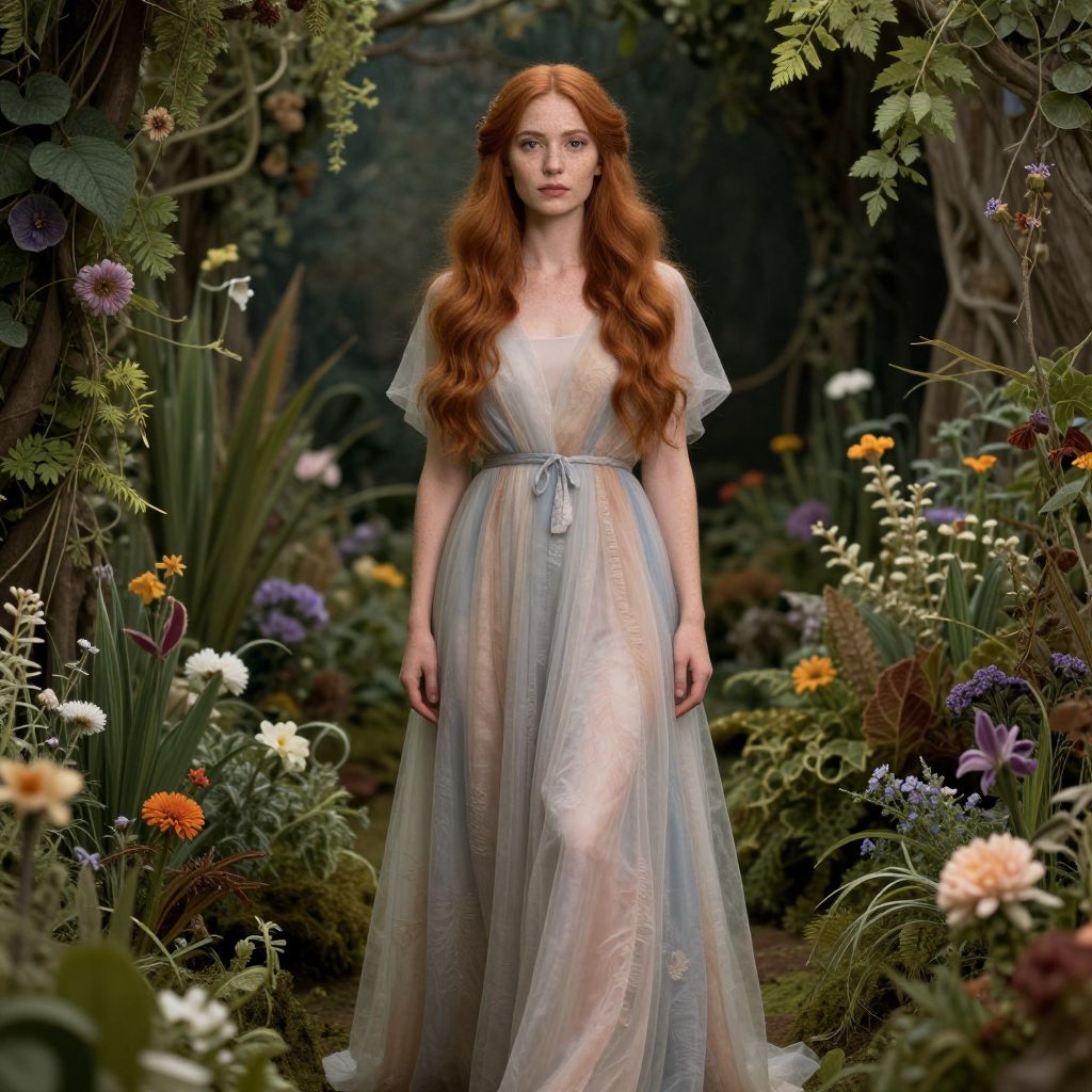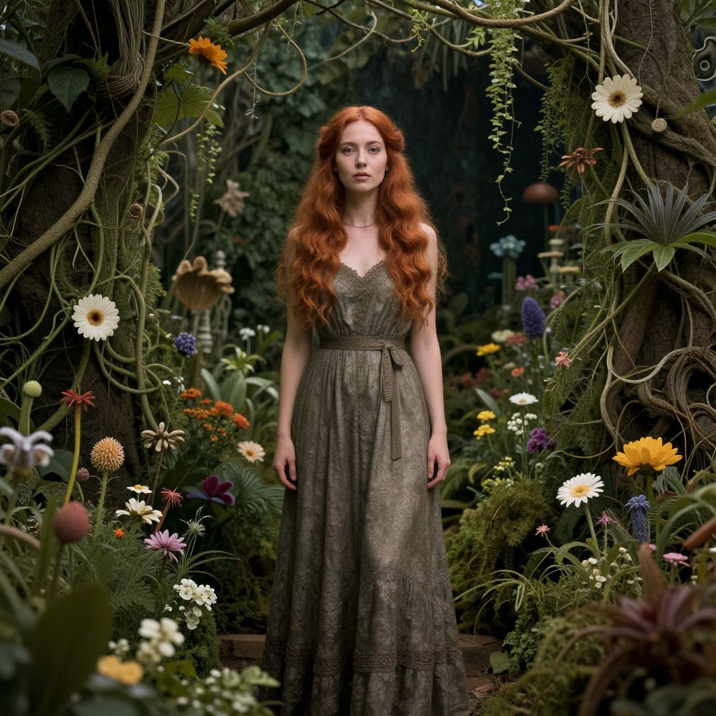 A woman with ginger hair in a flowing dress stands amidst a lush, fantastical forest filled with flowers and foliage.