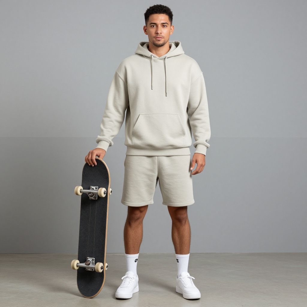Sweat Short Set Costume, man standing in a room with a skateboard