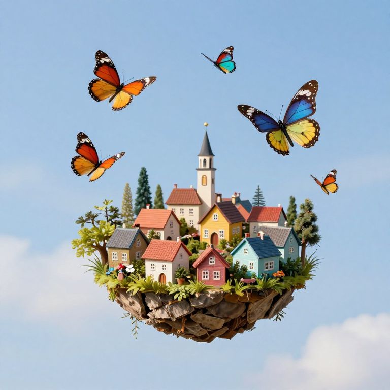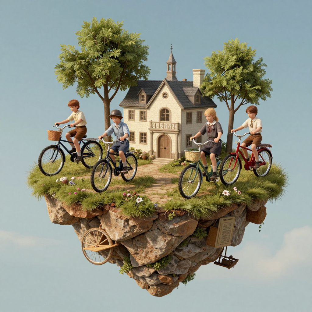 Digital illustration of six children riding bicycles on a grassy, floating rock platform against a clear blue sky. The platform supports a quaint, cream-colored house with a slate roof and a central spire, surrounded by two lush green trees. The children, wearing vintage-style clothing, are evenly spaced in a semi-circle, each with a different colored bicycle. The rock platform has detailed textures and small white flowers. The house has a sign reading "Welcome" above the door. The overall style is whimsical and surreal, reminiscent of classic children's book illustrations.