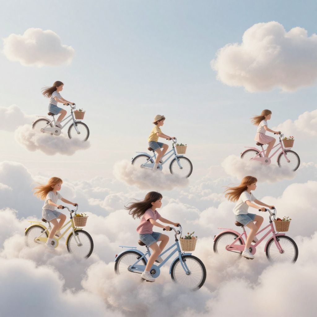 On a floating island powered by nostalgia, children’s bicycles collect history, and their wheels spin through centuries.