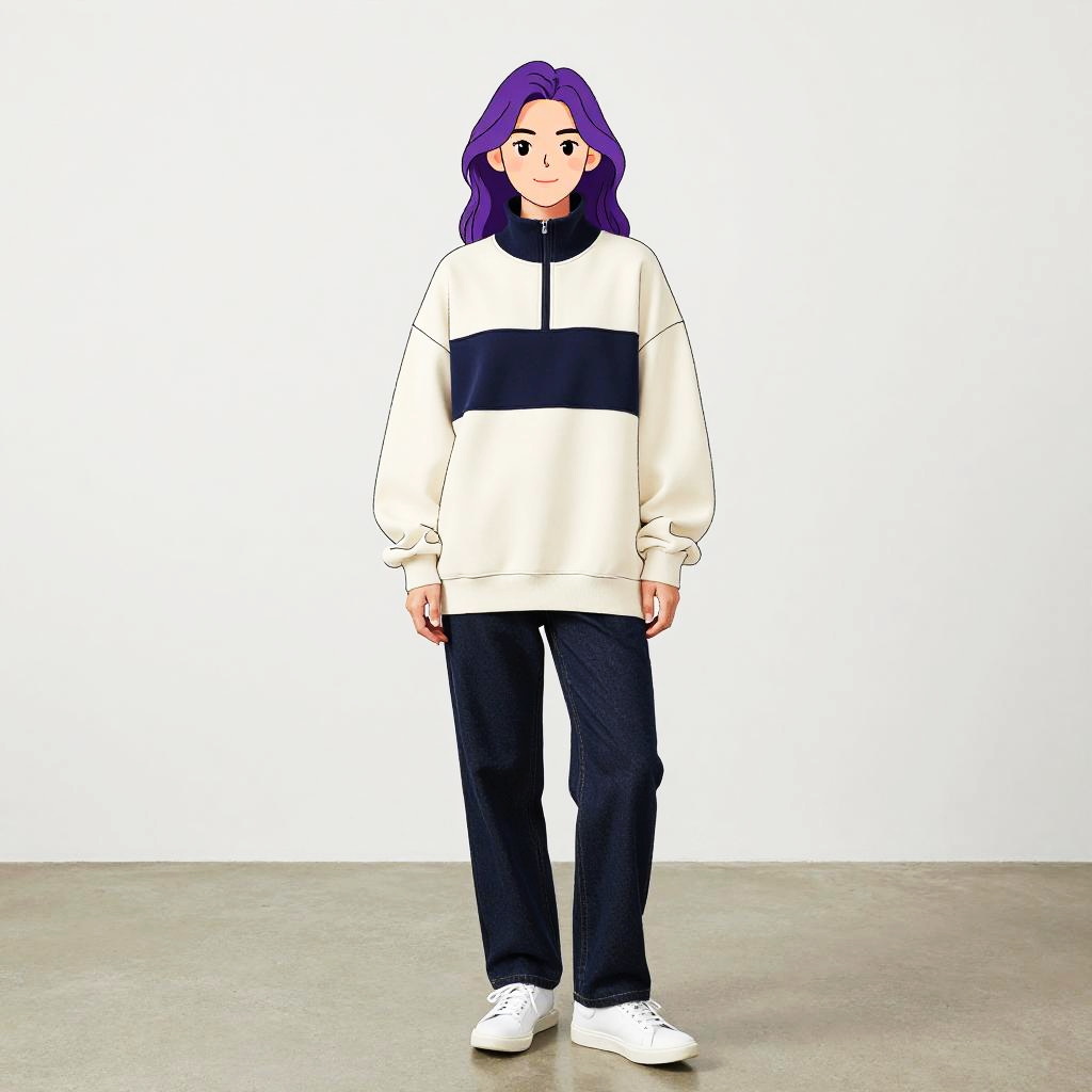 Woman with pretty face and pretty hair. Man, casual sportswear, oversized quarter-zip pullover in cream with navy blue horizontal panel, ribbed stand collar, long sleeves with fitted cuffs, dark denim jeans, straight cut, white lace-up sneakers, plain design, neutral indoor background with concrete floor and white walls. --sref 1467