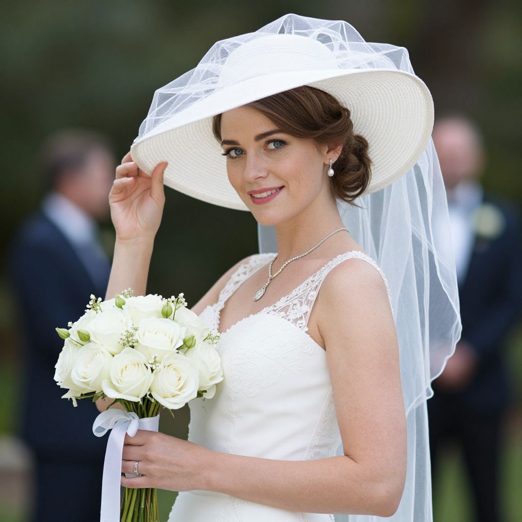 Carole baskin wedding, 1girl, dress, solo, hat, bouquet, wedding dress, brown hair, flower, white dress, blurry background, blurry, veil, sun hat, holding, looking at viewer, smile, white headwear, holding bouquet, blue eyes, jewelry, short hair
