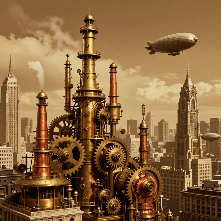 Steampunk cityscape with intricate, copper and brass gears, tall chimneys, and a flying blimp against a sepia-toned skyline of