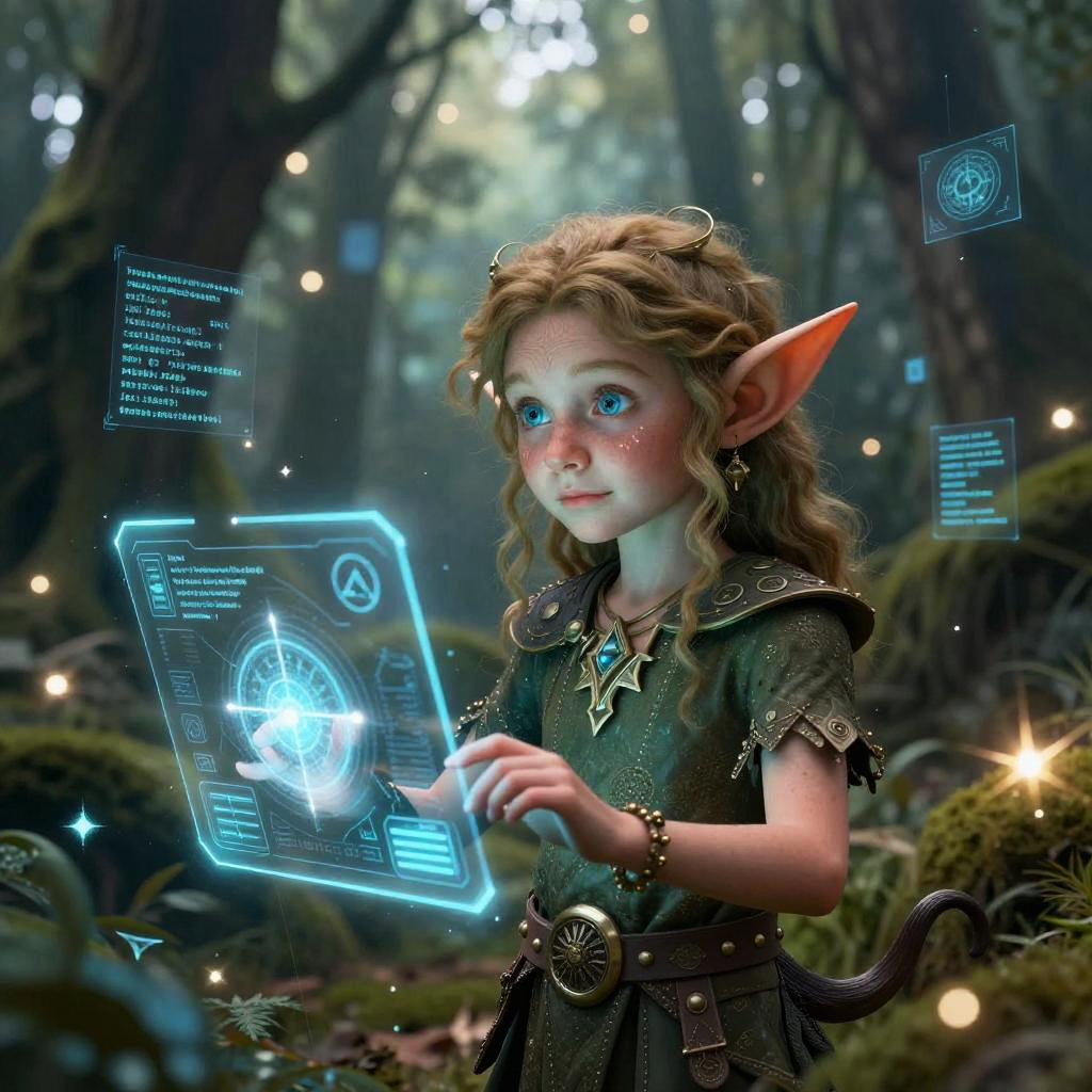 Elf AI generator, a digital elf crafting spells through a holographic AI interface, surrounded by floating code and magical glyphs, enchanted cybernetic forest background with sparkling lights, blend of fantasy art and technology, high resolution and dynamic composition.