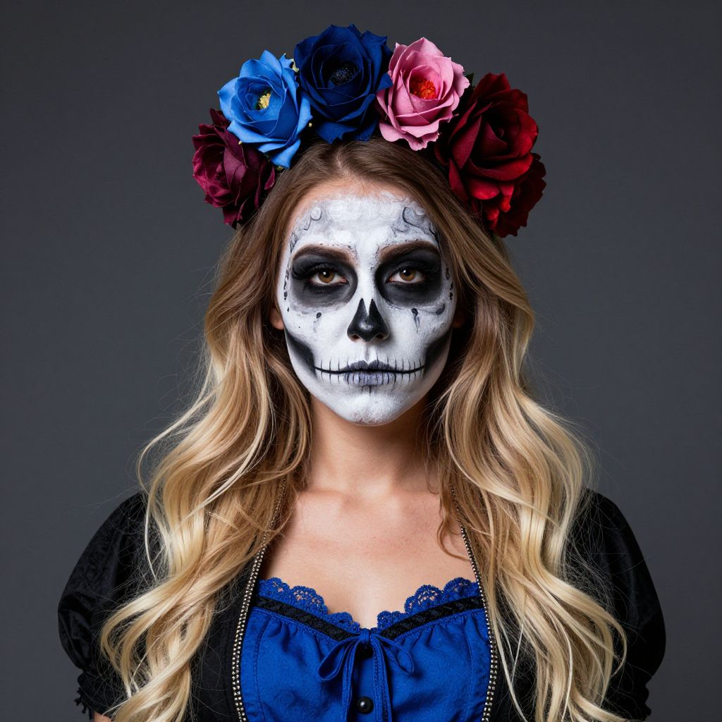 A woman with long blonde hair adorned with flowers, wearing a blue and black outfit, has a skull-like face paint and a black nose.