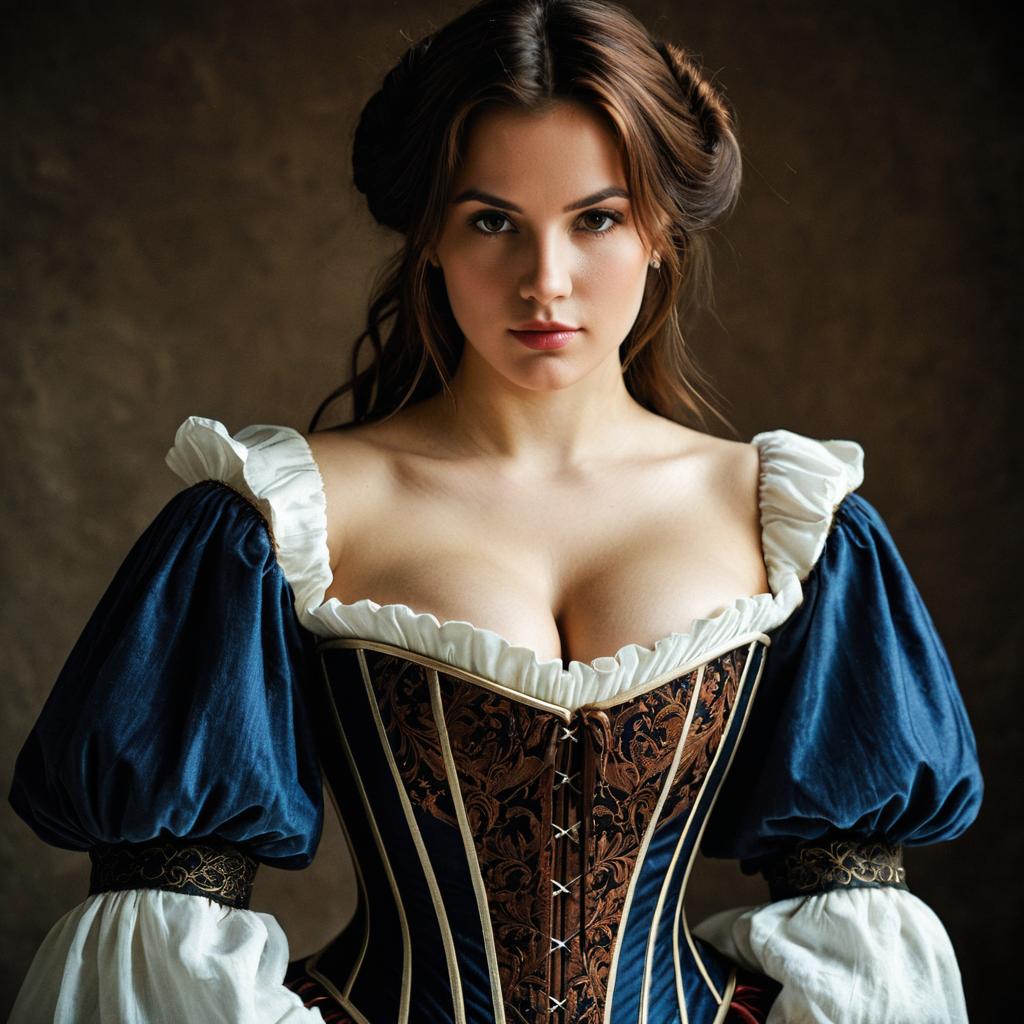 French provincial costume,1girl, realistic, long hair, solo, blonde hair, looking at viewer, dress, blurry, corset, blurry background, lips, brown hair, skirt, curly hair