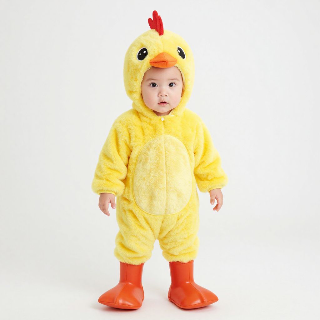 Photograph of a baby standing on a paved path, wearing a yellow, hooded, plush baby outfit, with a blurred green and yellow flower background
