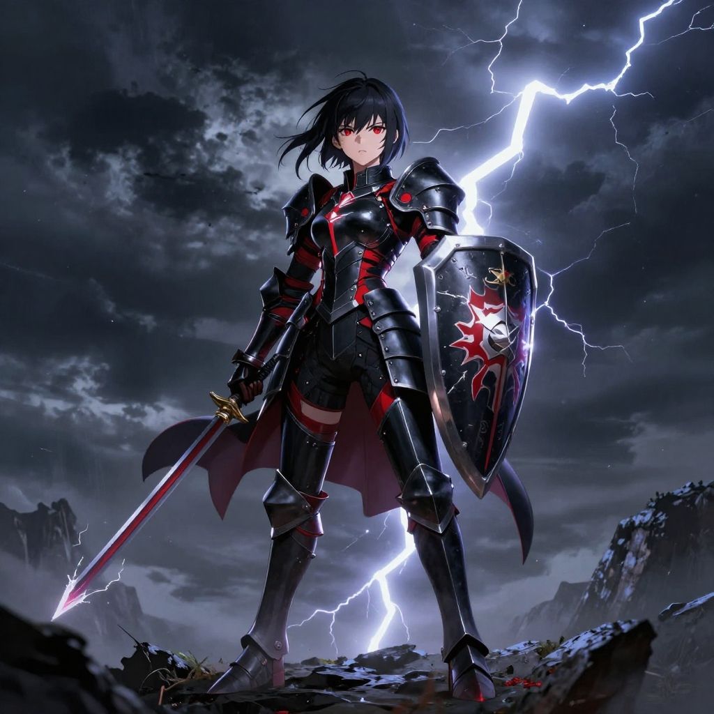 Digital anime artwork of a fierce, armored female warrior with black hair and red eyes, standing in a stormy, lightning-filled landscape, holding a shield