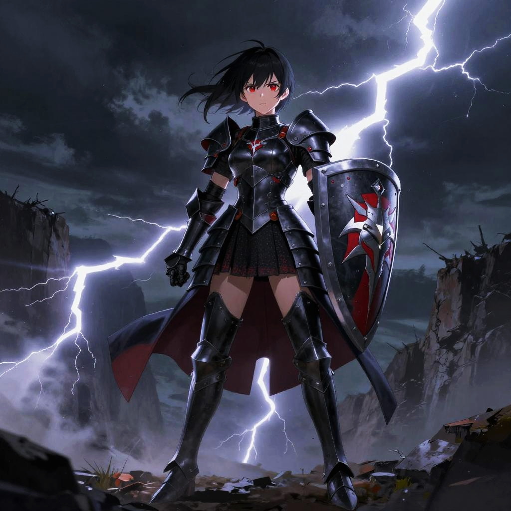Anime knight girl in black and red armor, standing defiantly with a large shield on a stormy cliffside, lightning illuminating the dark, intense fantasy atmosphere